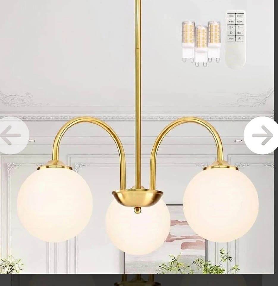 This modern globe chandelier comes with 3 tri-color dimmable G9 bulbs and a remote. Switch between bright white, soft neutral, and warm glow. Retail price was $218 plus taxes.