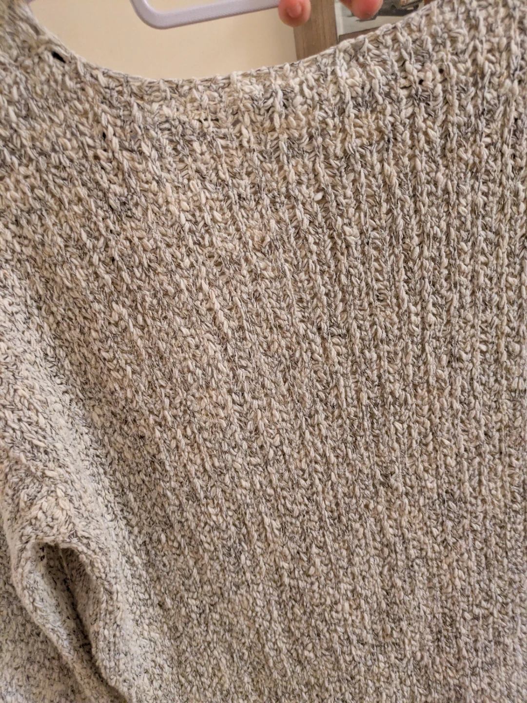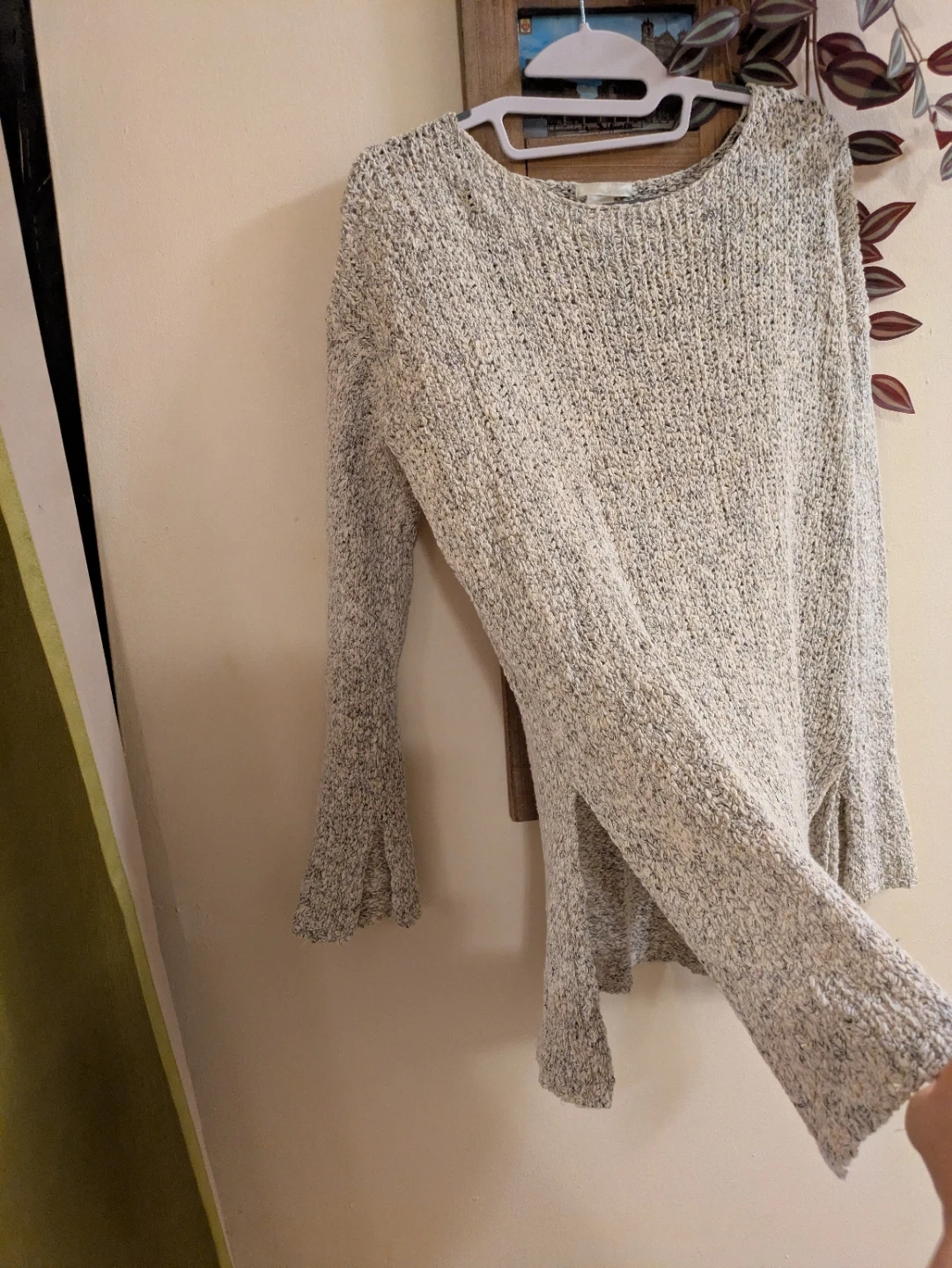 Long sleeve knit sweater, side slits, in a neutral grey colour. It's perfect for layering on cooler days. Great for everyday wear!