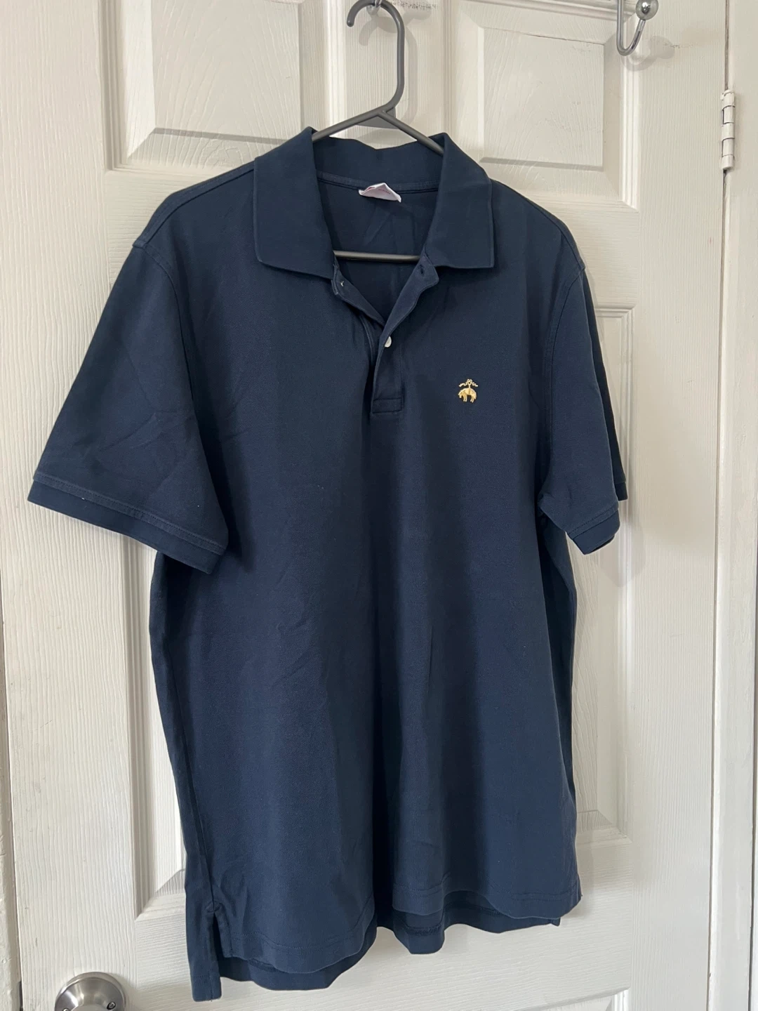 Navy blue short-sleeve polo shirt from Brooks Brothers. Features the brand's signature golden fleece logo. Original Fit. Made in Vietnam.