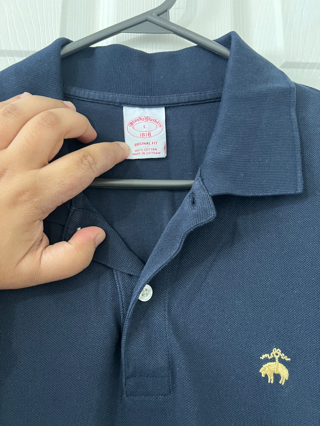 Navy blue short-sleeve polo shirt from Brooks Brothers. Features the brand's signature golden fleece logo. Original Fit. Made in Vietnam.