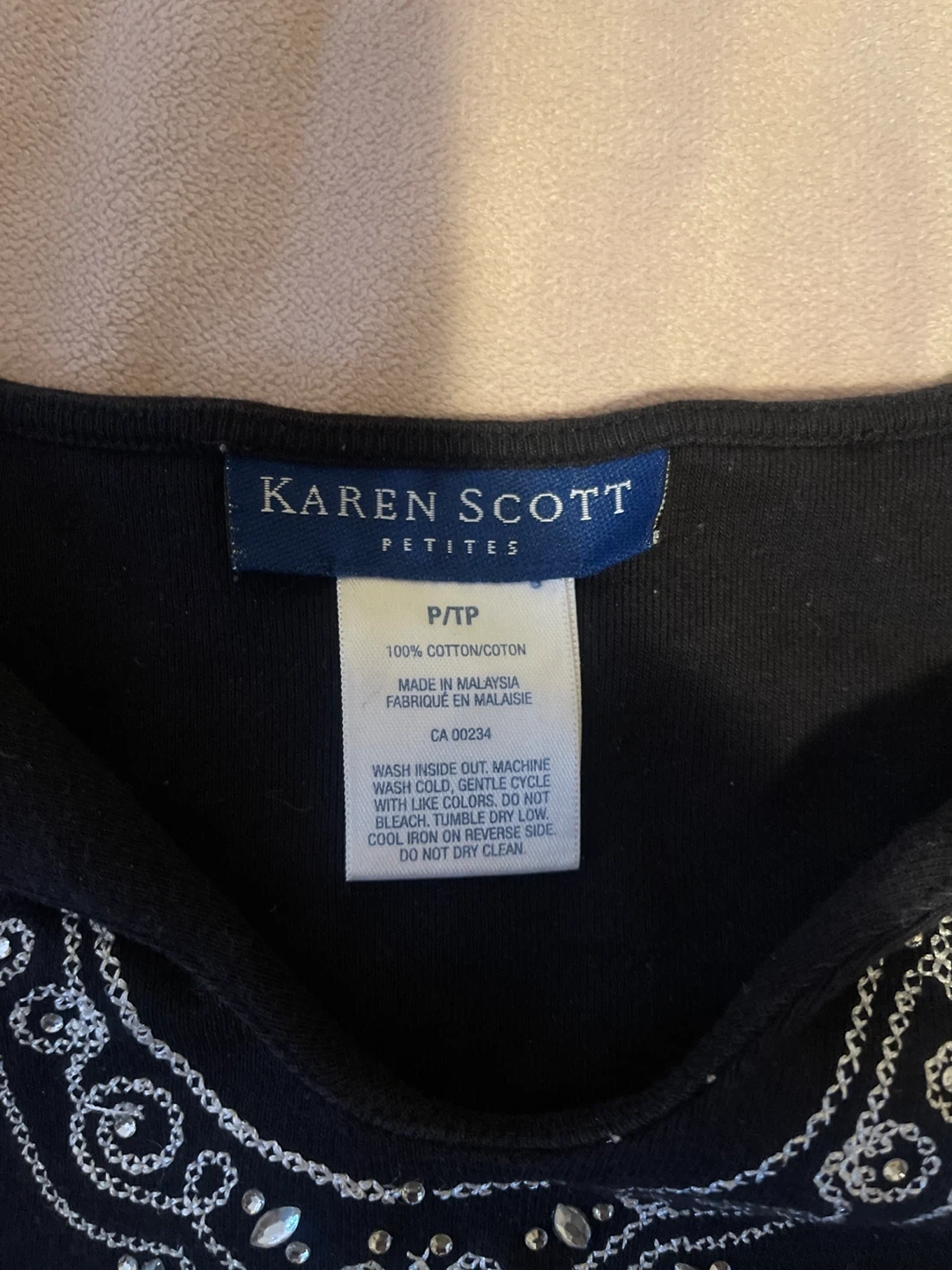 Selling a Karen Scott Petites black top in size P/TP. It's made of 100% cotton and has a lovely design around the neckline. The label says it's machine washable with like colours, gentle cycle, wash cold. Do not bleach, and cool iron on reverse side. Do not dry clean