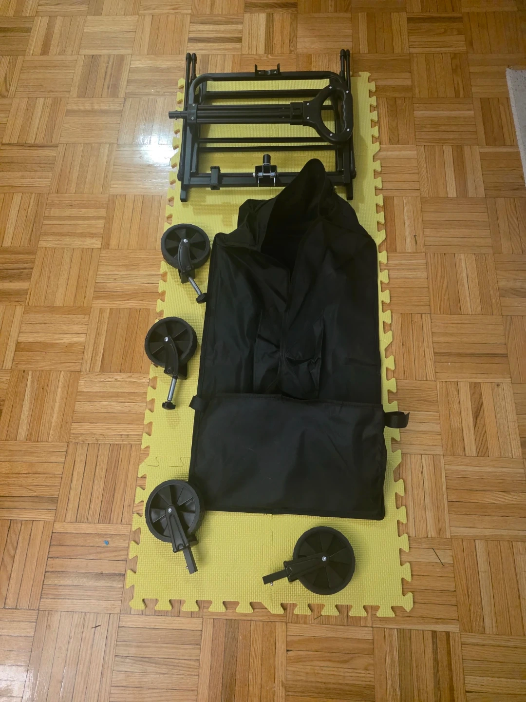 This is a black folding outdoor wagon cart. It comes with wheels and a storage bag. It's designed for easy transport of gear to the beach or park. The frame is made of durable metal.