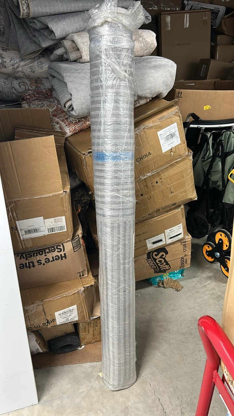 Grey and white geometric patterned area rug. Material appears to be synthetic. Adds a modern touch to any room. Comes rolled for easy transport.