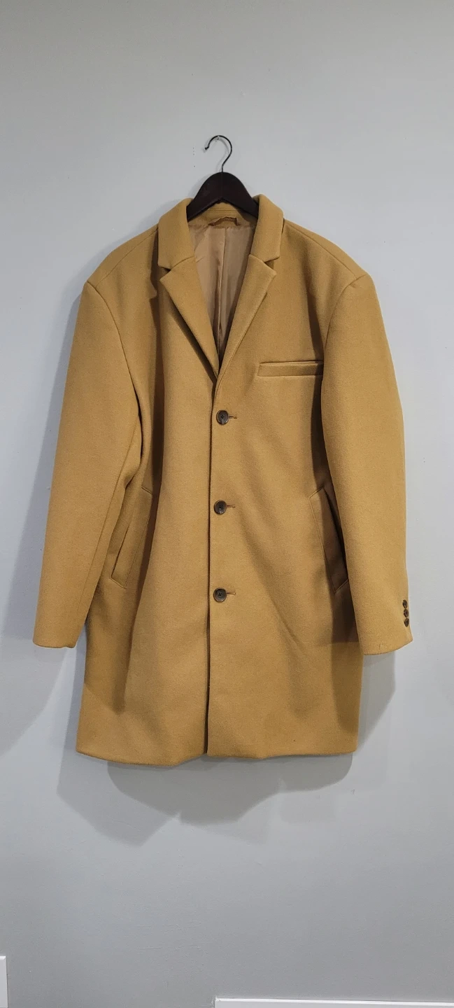 Classic camel coloured topcoat from Old Navy. It's a size large and made from a wool blend. This coat is great for layering over a suit or casual wear during cooler weather.