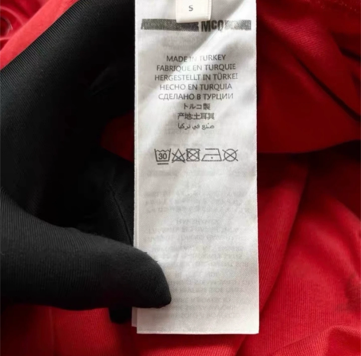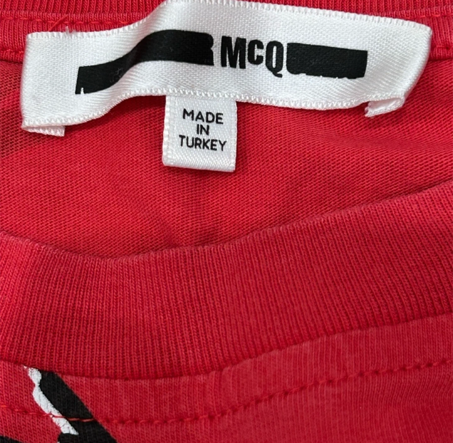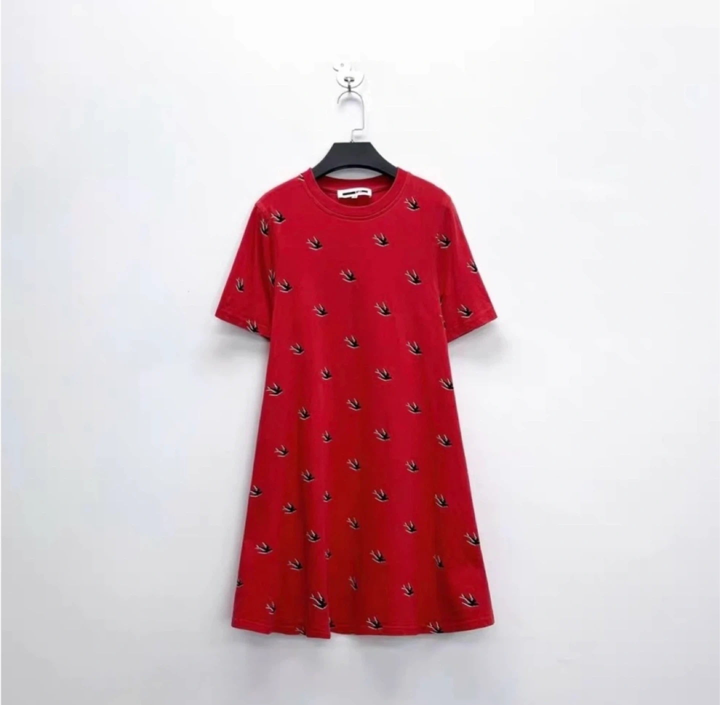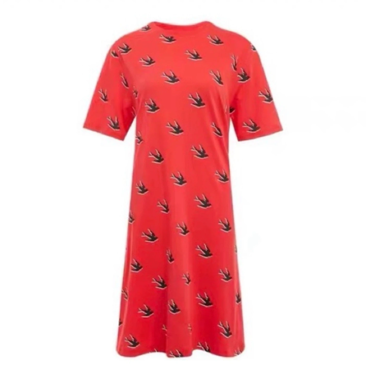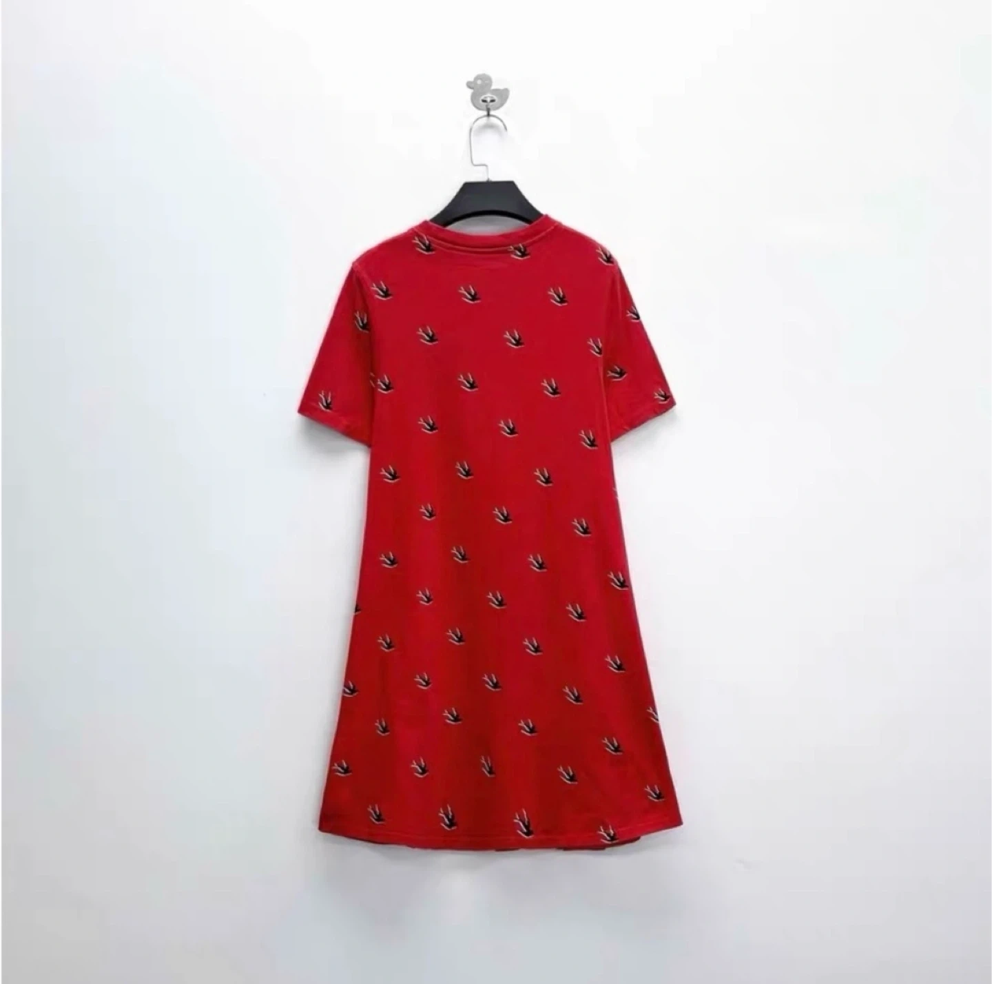 This is an MCQ red t-shirt dress with a swallow print. It's made in Turkey. Size small.
