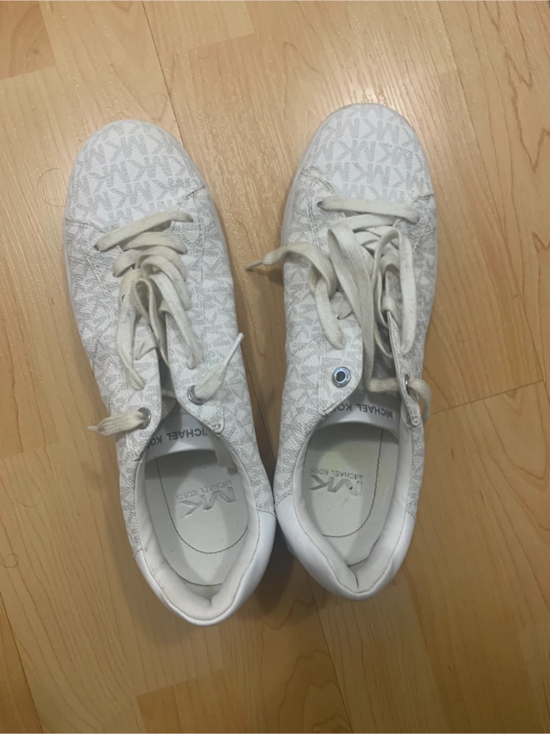 These Michael Kors sneakers feature the all-over MK logo print in white. They have a classic lace-up design with a comfortable low-top silhouette. The soles show some signs of wear, consistent with normal use.