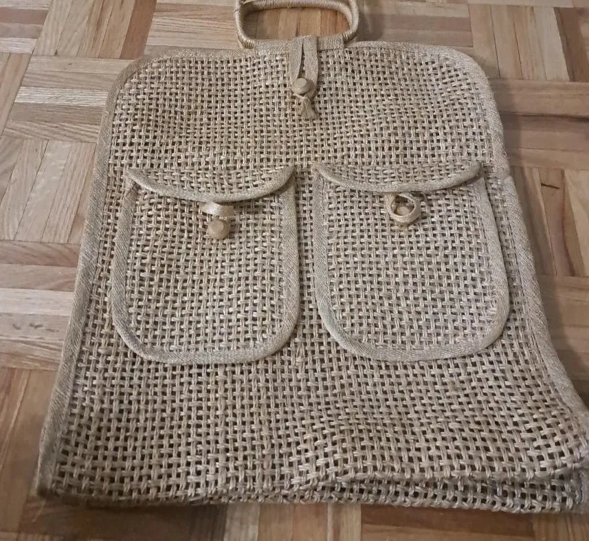This is a woven rattan handbag with a handle and two front pockets. It has a button closure for the flap and each of the pockets. Great for carrying essentials!