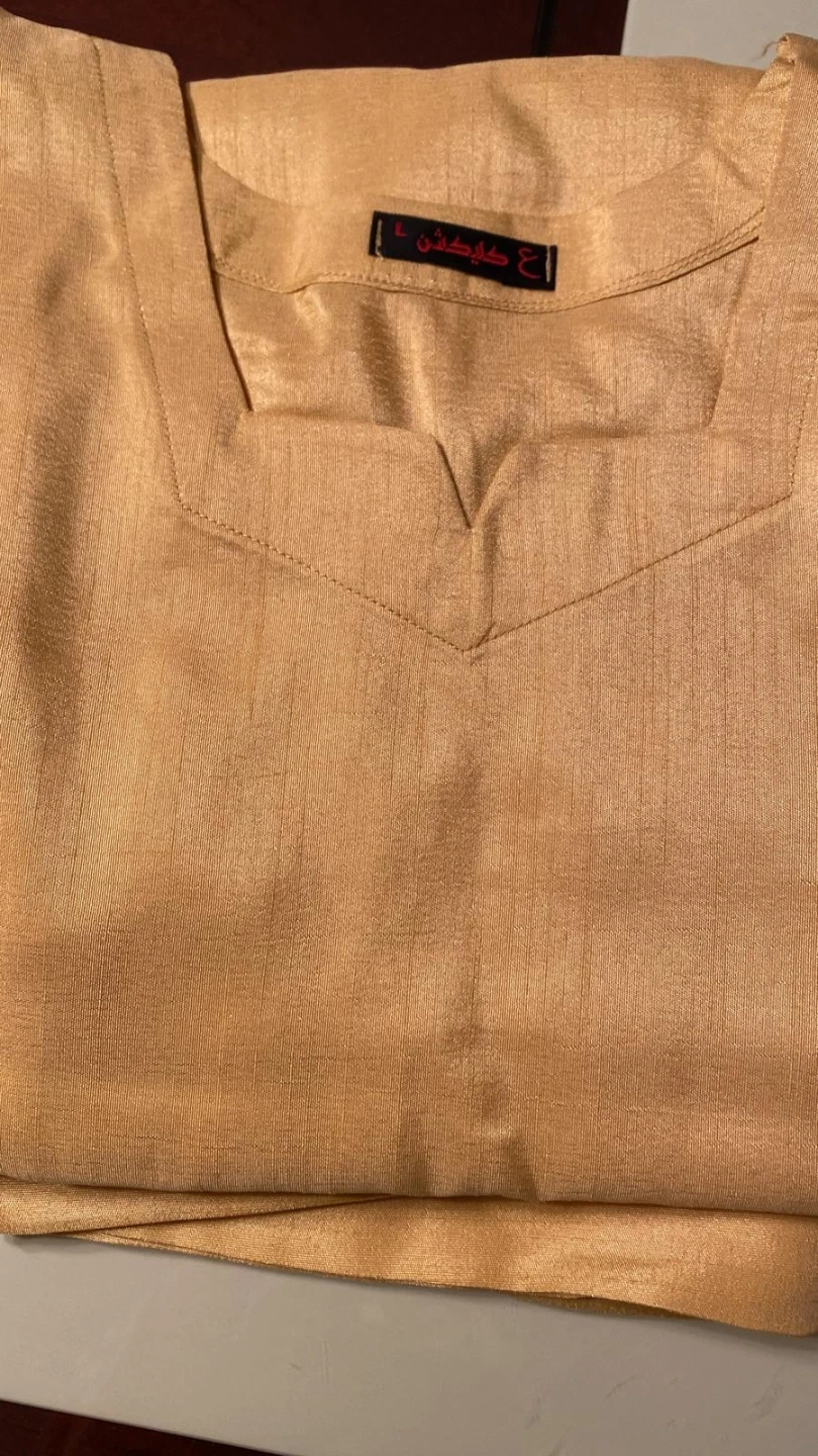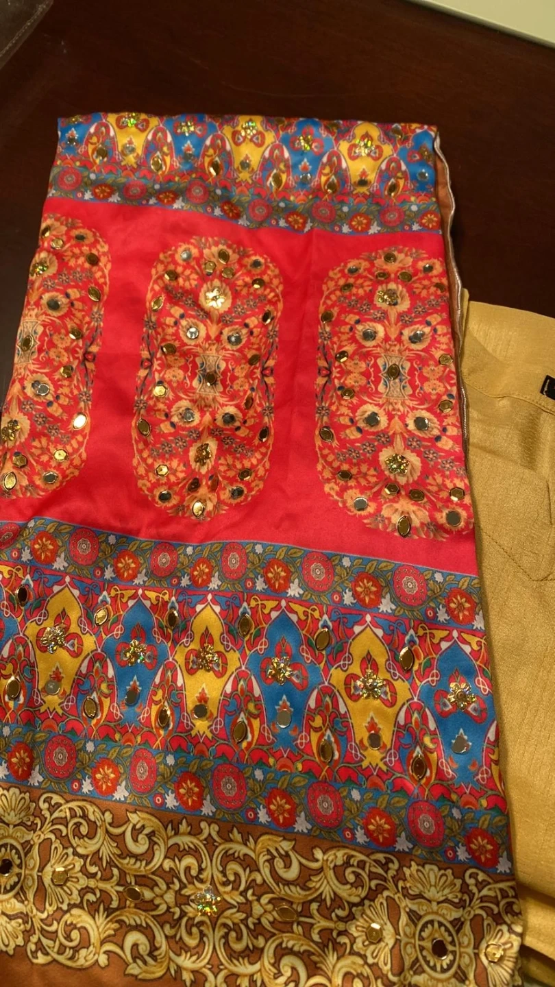Selling a traditional outfit in a beautiful gold tone! The fabric has a lovely sheen. Also included is a vibrant red patterned piece with intricate detailing. Perfect for special occasions!