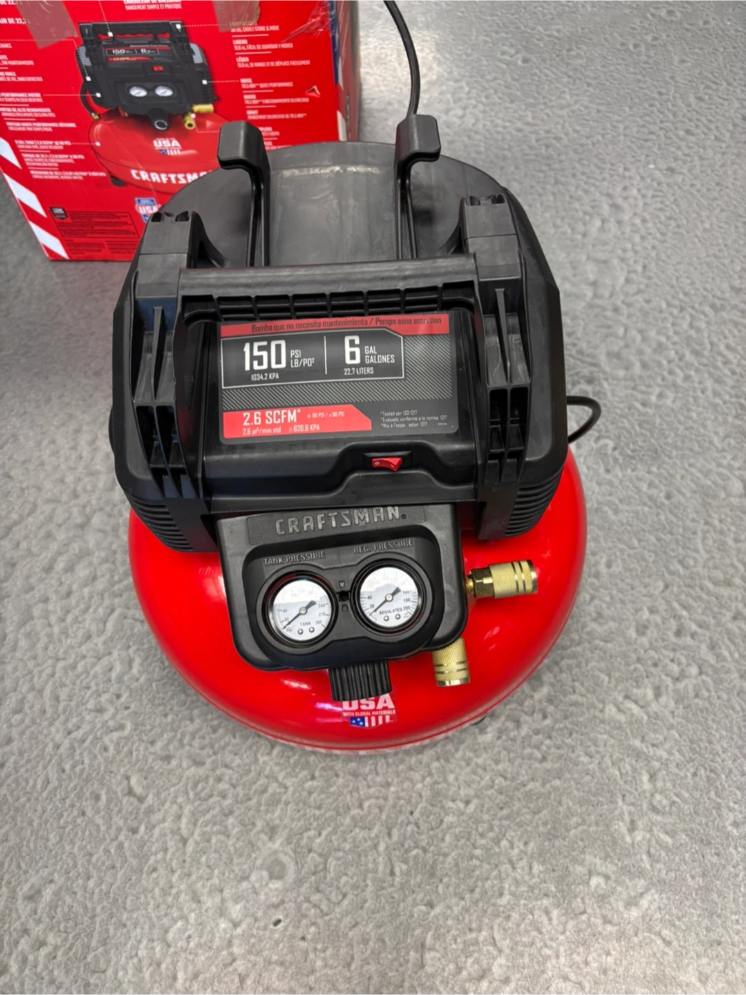 This Craftsman 6-gallon air compressor has a 150 PSI max pressure. It delivers 2.6 SCFM at 90 PSI and is maintenance-free. The tank is 6 gallons. Brand new. If you like to come and test the compressor before purchase, I am located at. 410 16 Ave NE Trans-Canada Building