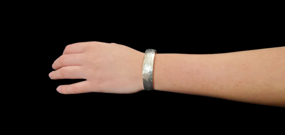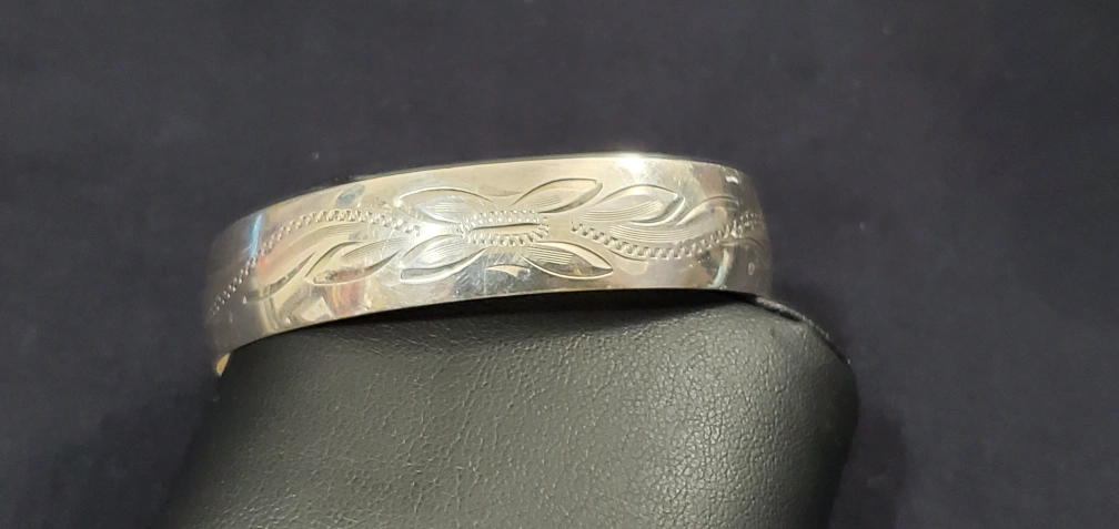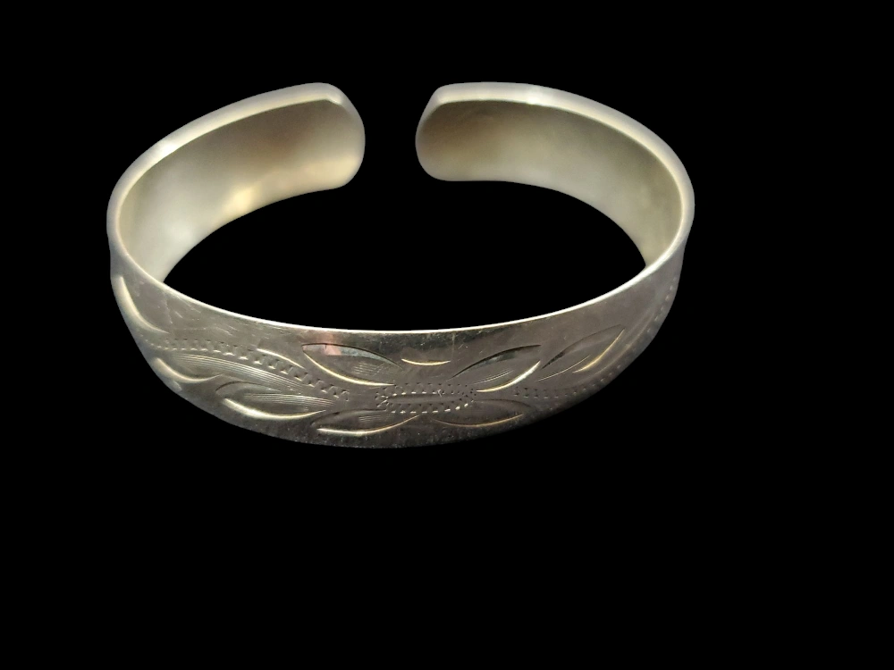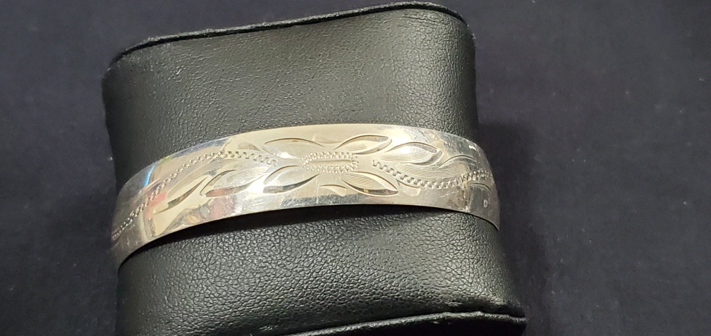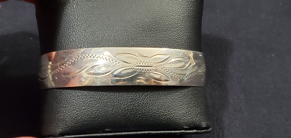 Beautiful sterling silver cuff bracelet. Features an engraved floral design. Simple, elegant design. Suitable for everyday wear.