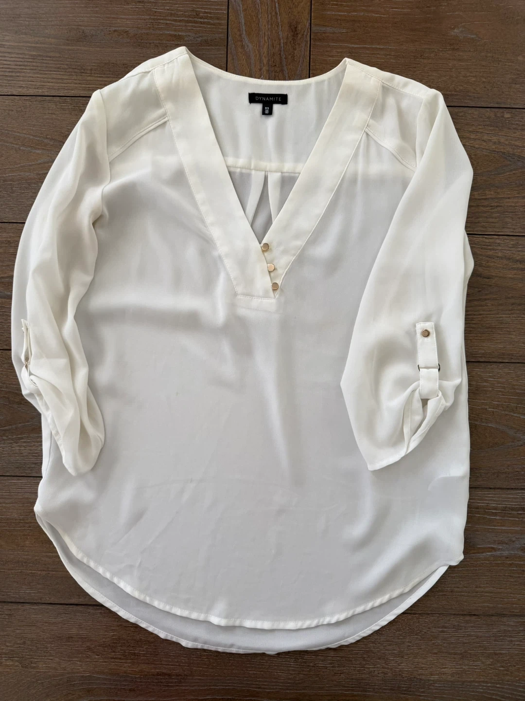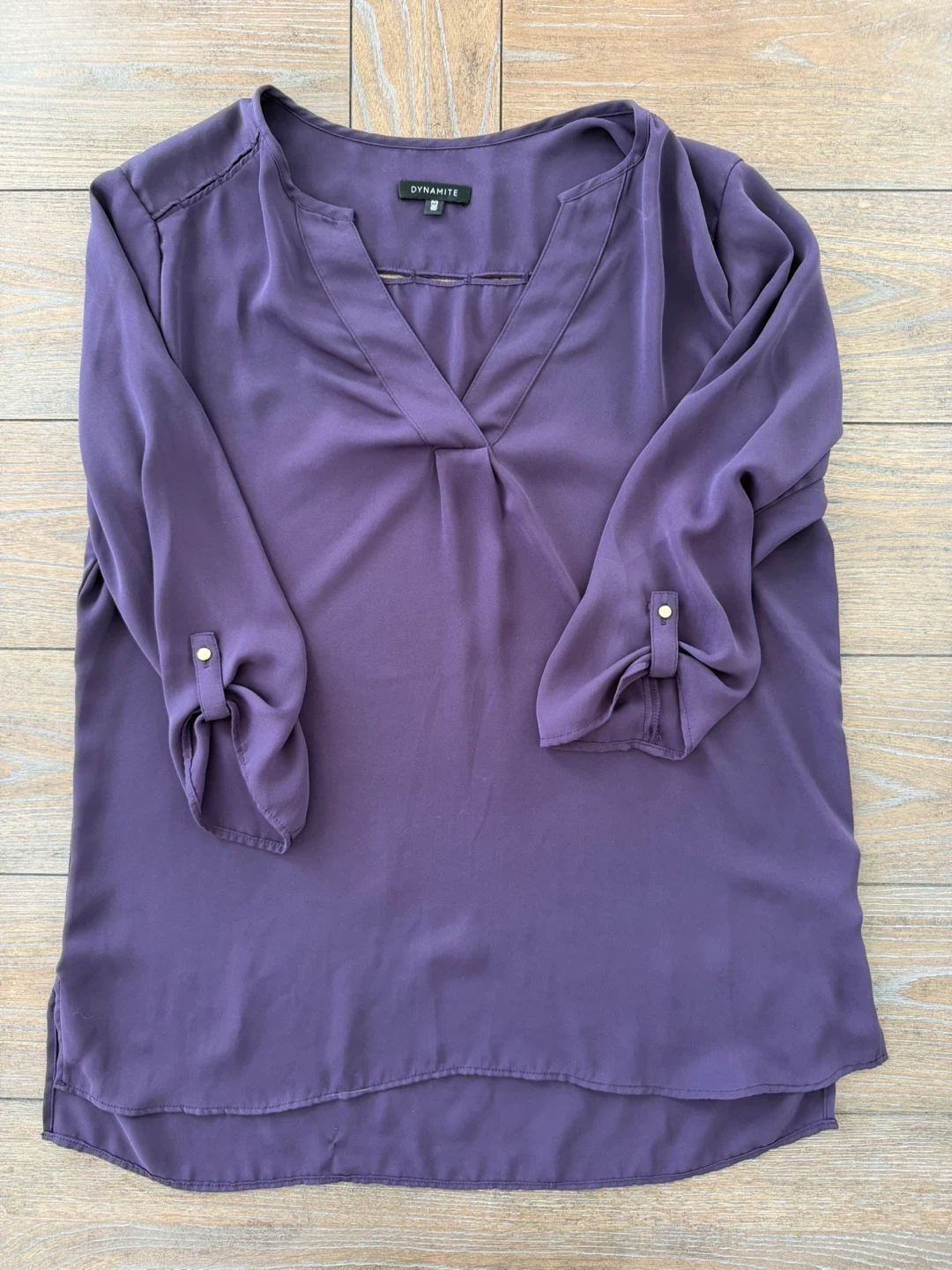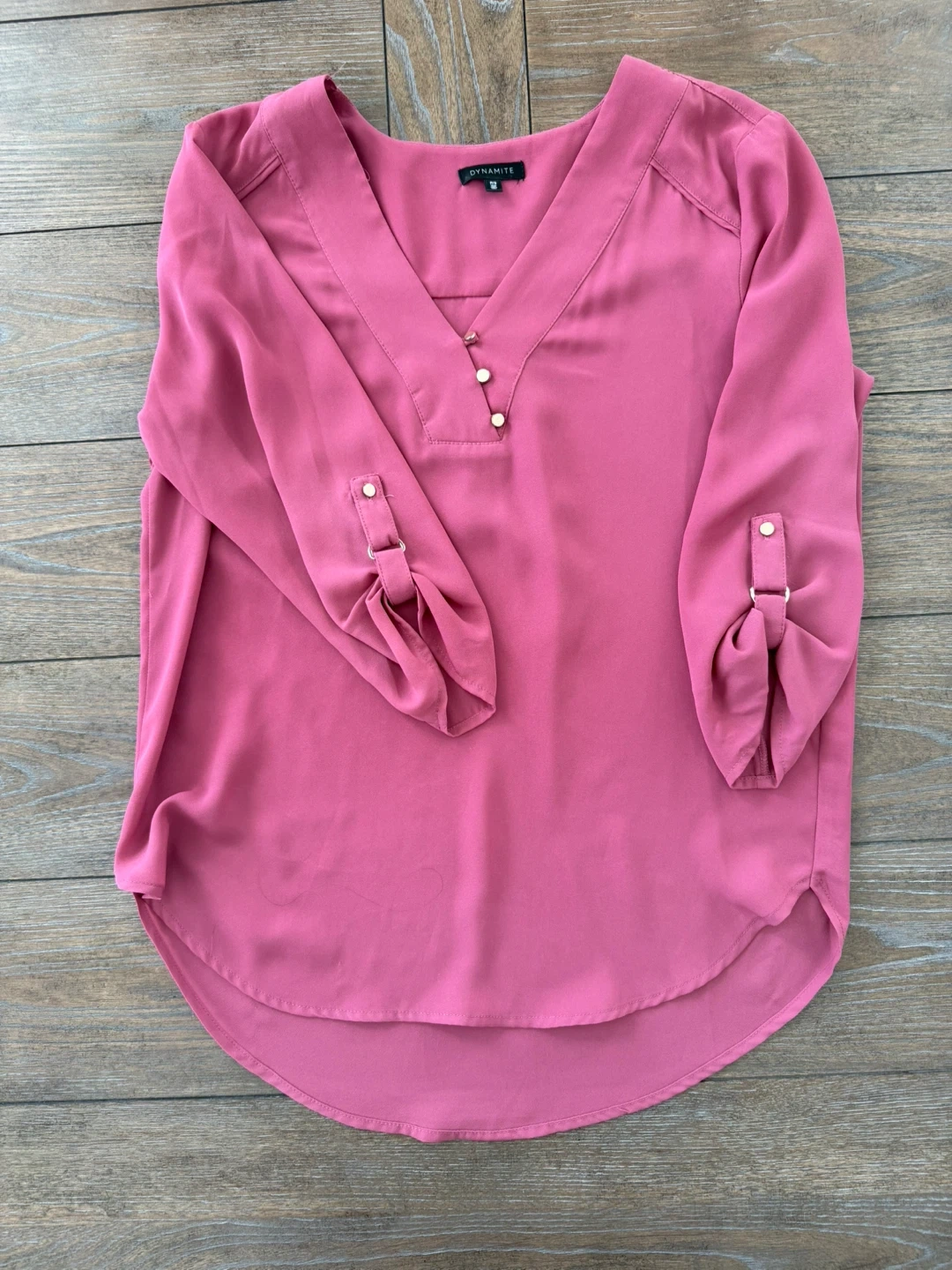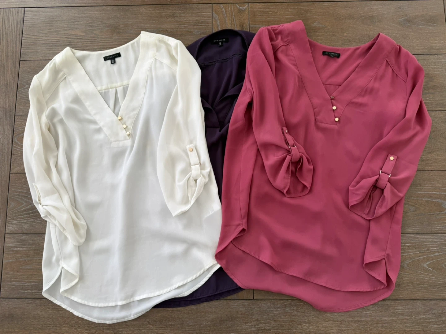 Bundle of three Dynamite blouses, each featuring a V-neck and roll-tab sleeves. Available in white, deep purple, and dusty rose pink. These blouses are lightweight and perfect for layering or wearing on their own.