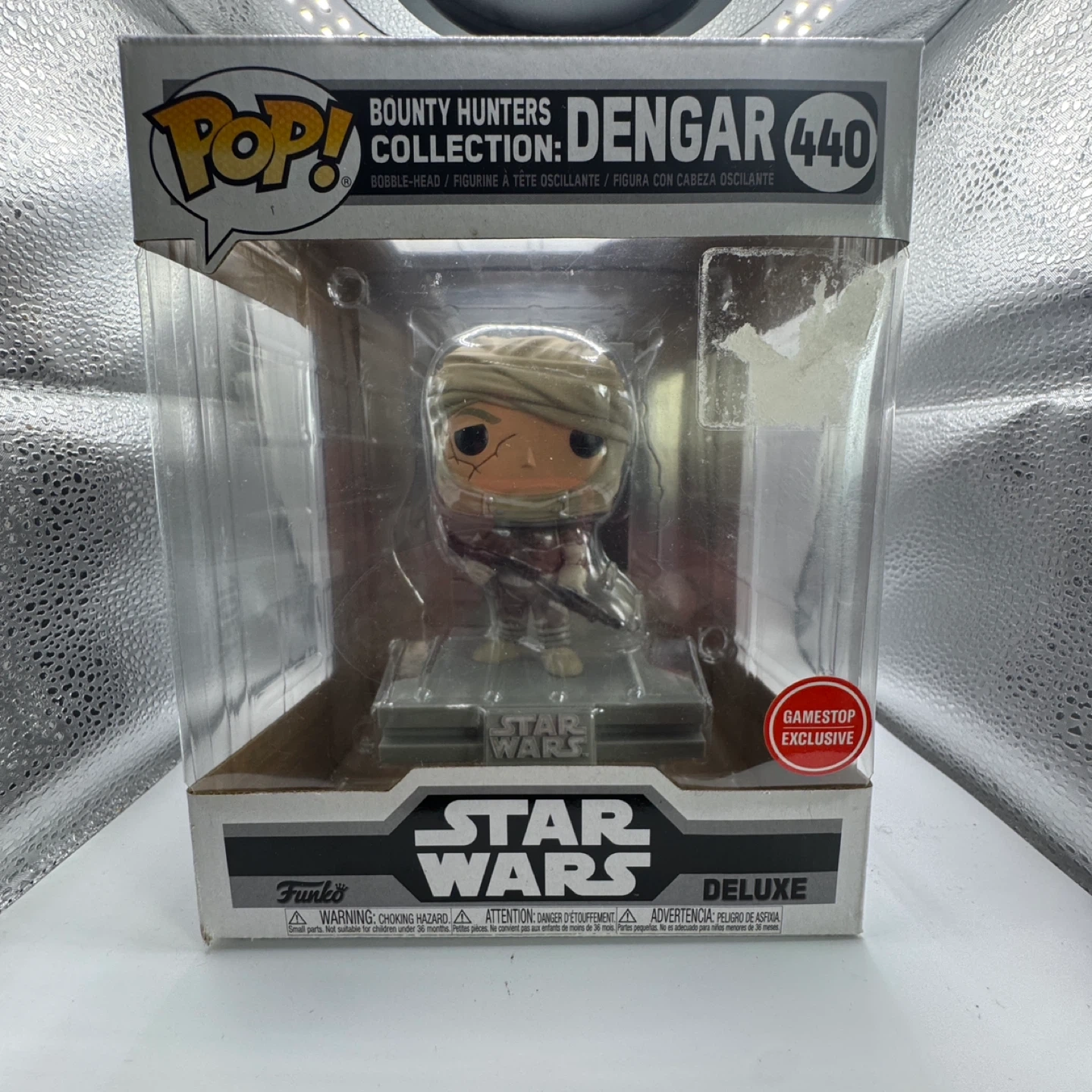 This is a Funko Pop! Deluxe bobble-head figure of Dengar from Star Wars. It's part of the Bounty Hunters Collection. This item is a GameStop exclusive. It's not suitable for children under 36 months due to small parts.