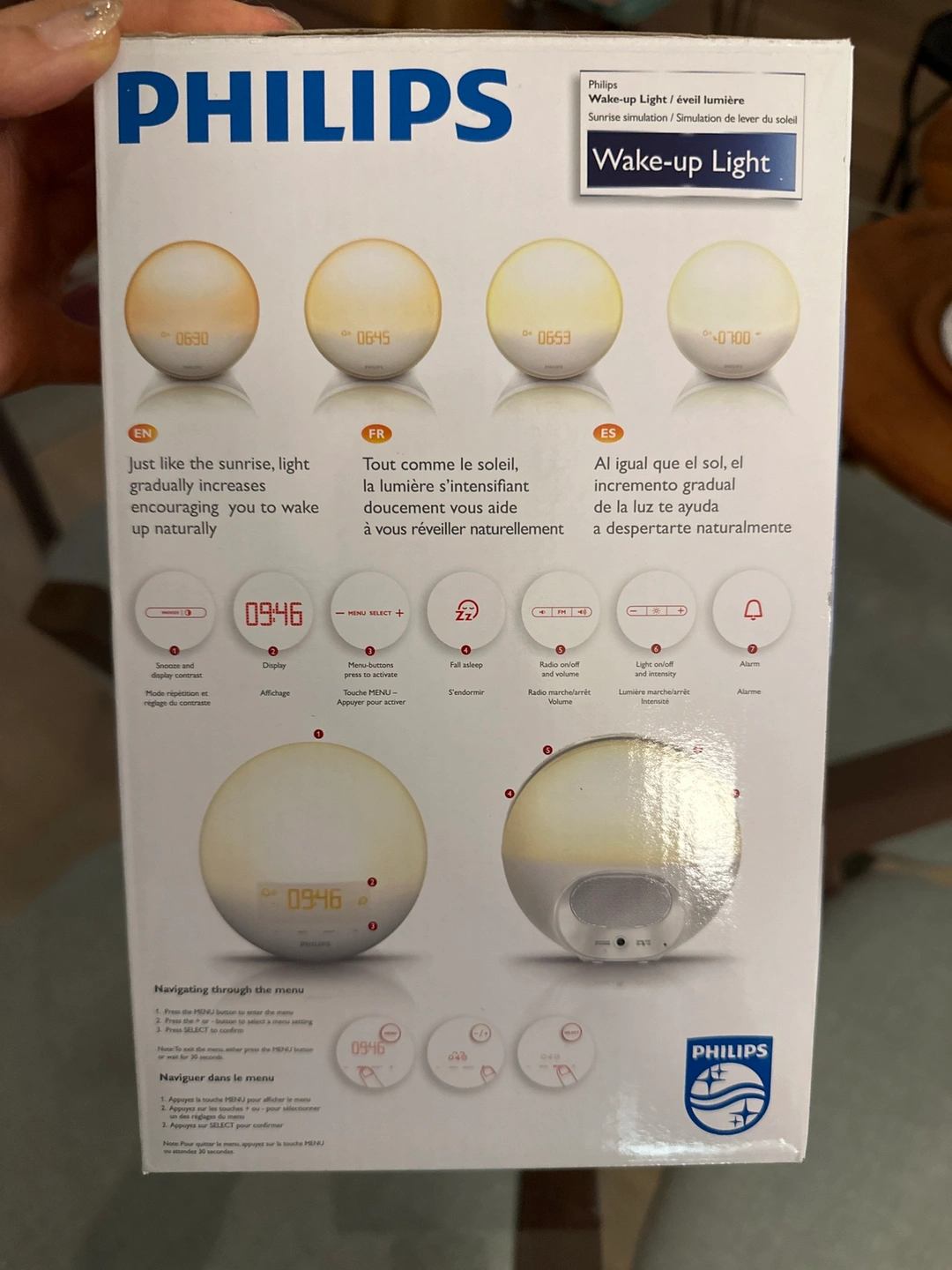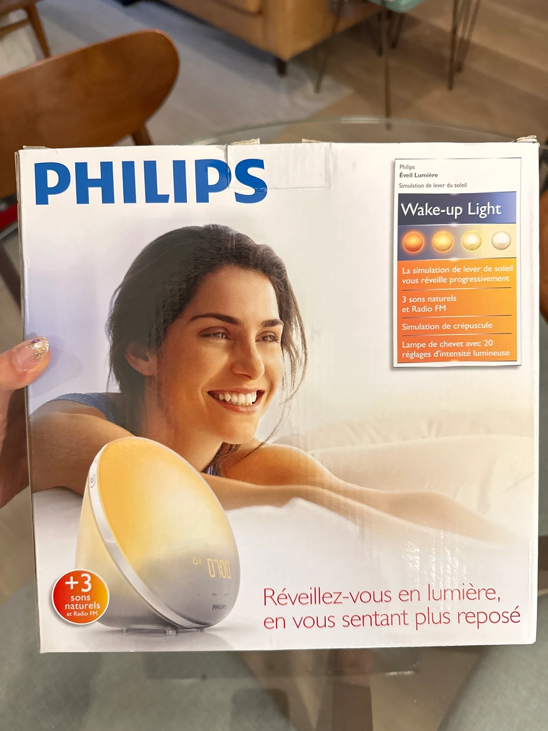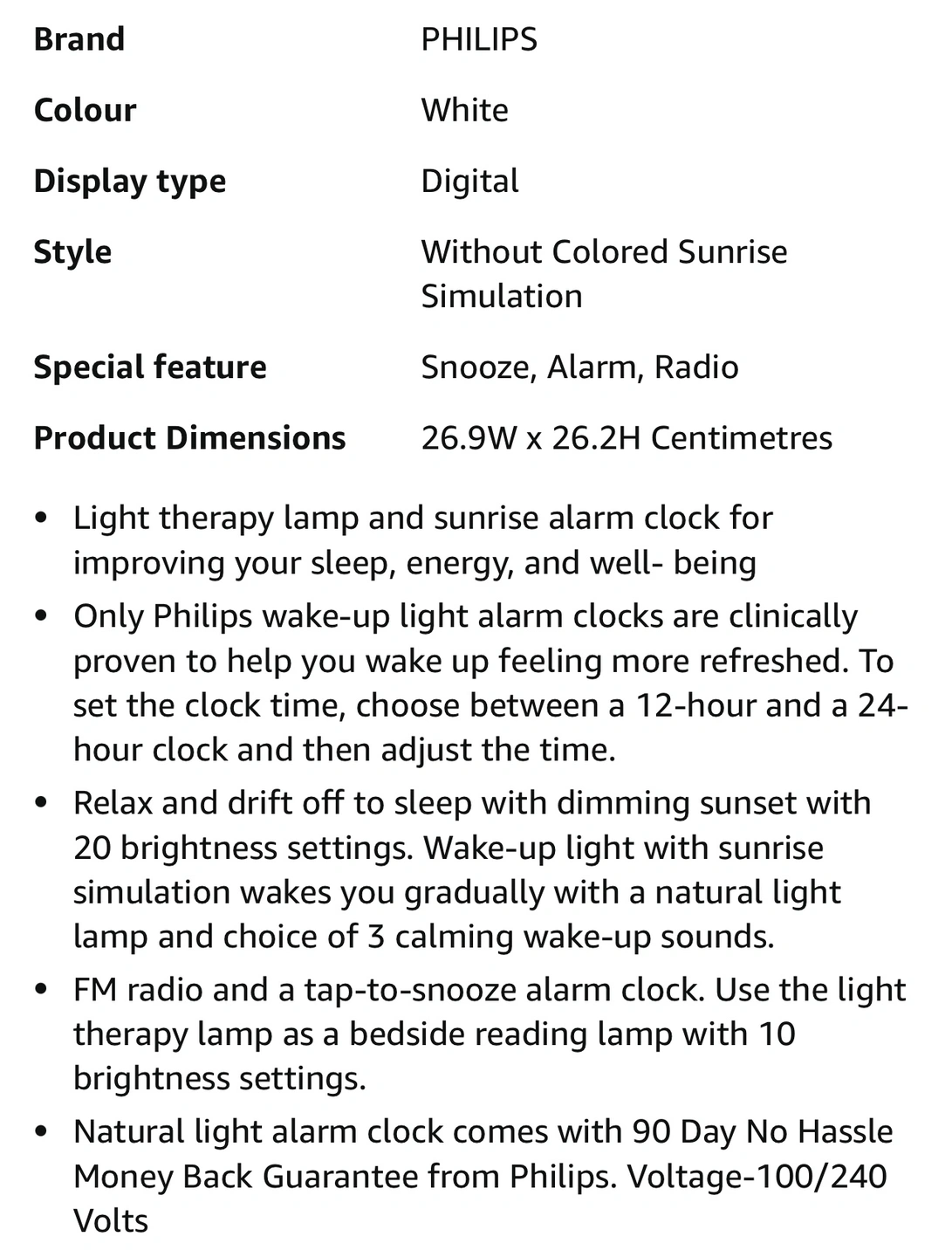 Philips Wake Up Light with sunrise simulation and 20 brightness levels. It also features 3 nature sounds and a built in FM radio.