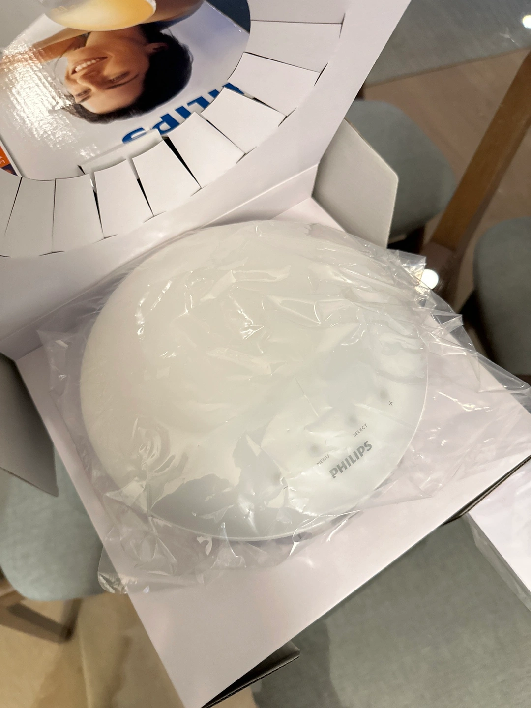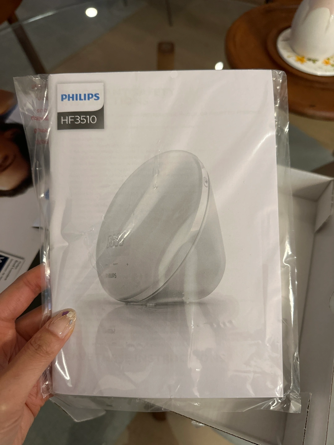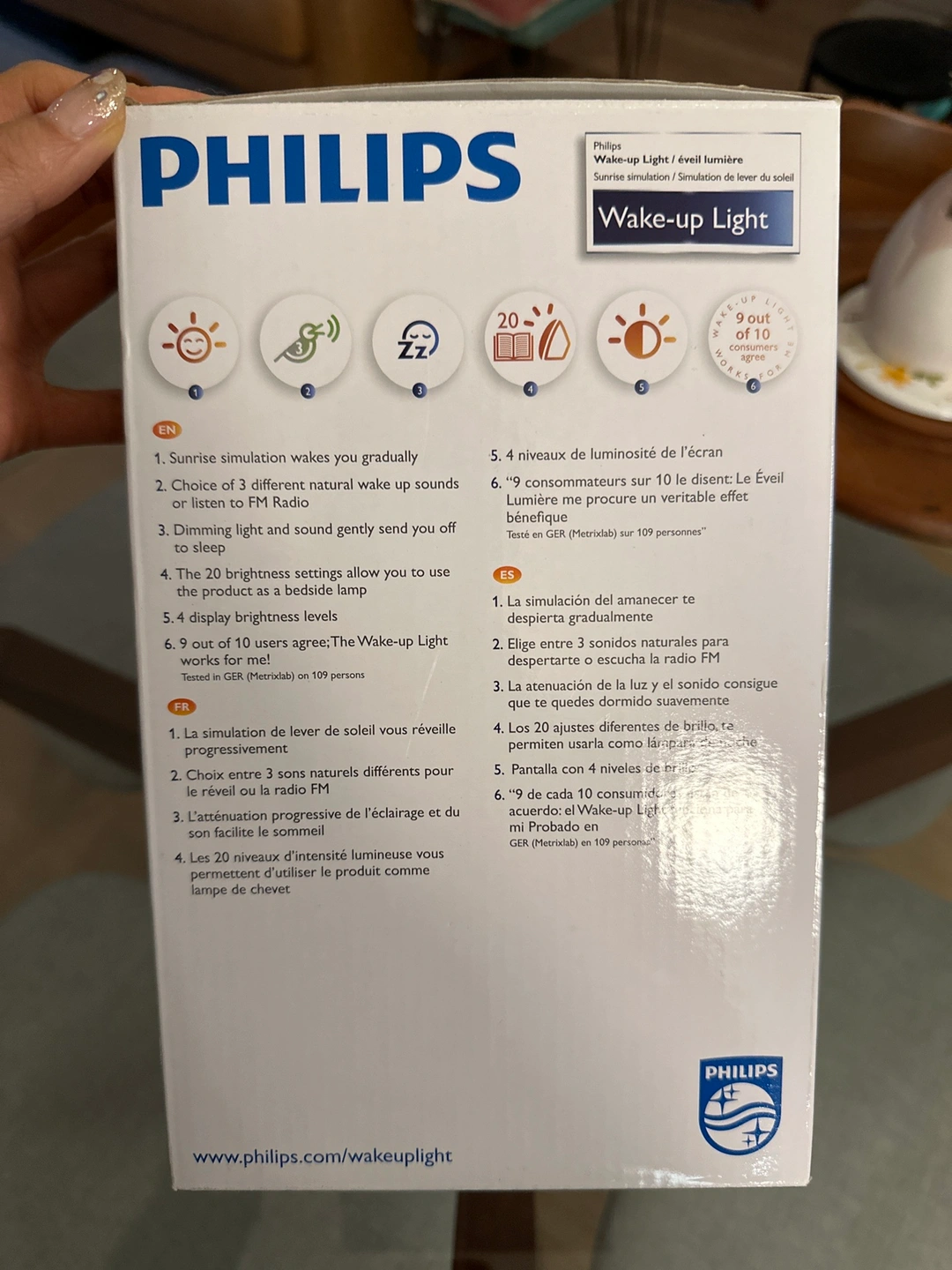 Philips Wake Up Light with sunrise simulation and 20 brightness levels. It also features 3 nature sounds and a built in FM radio.
