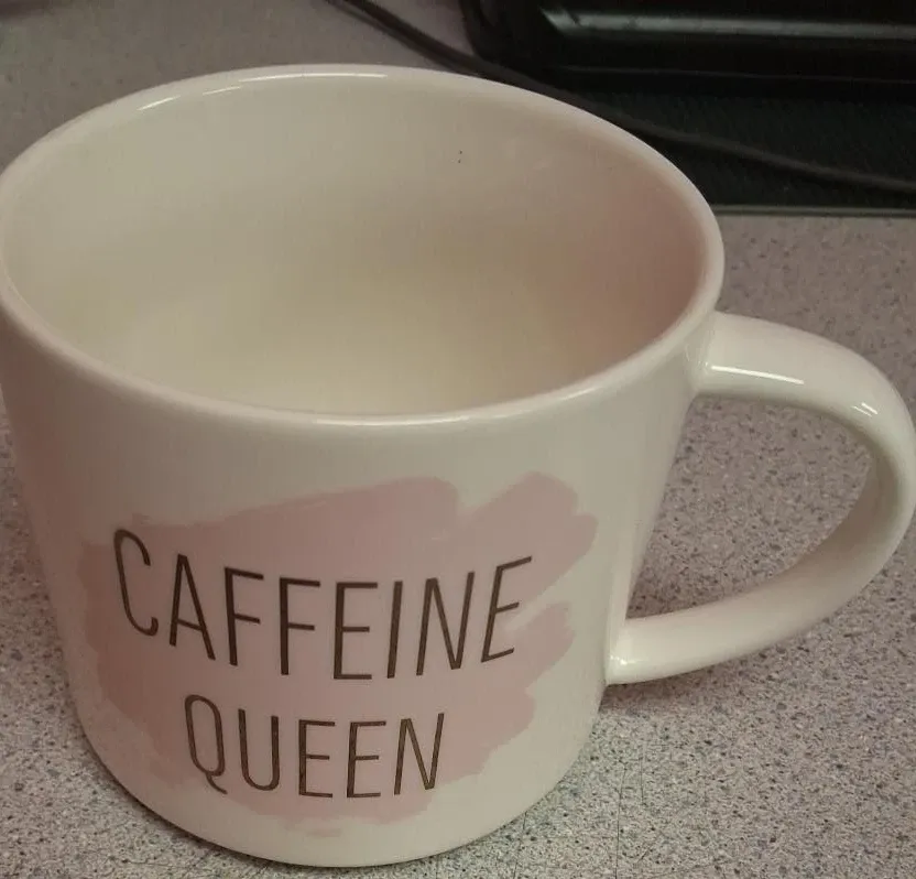White ceramic mug with "Caffeine Queen" text. Made from porcelain. It's microwave and dishwasher safe. Great for starting your morning!