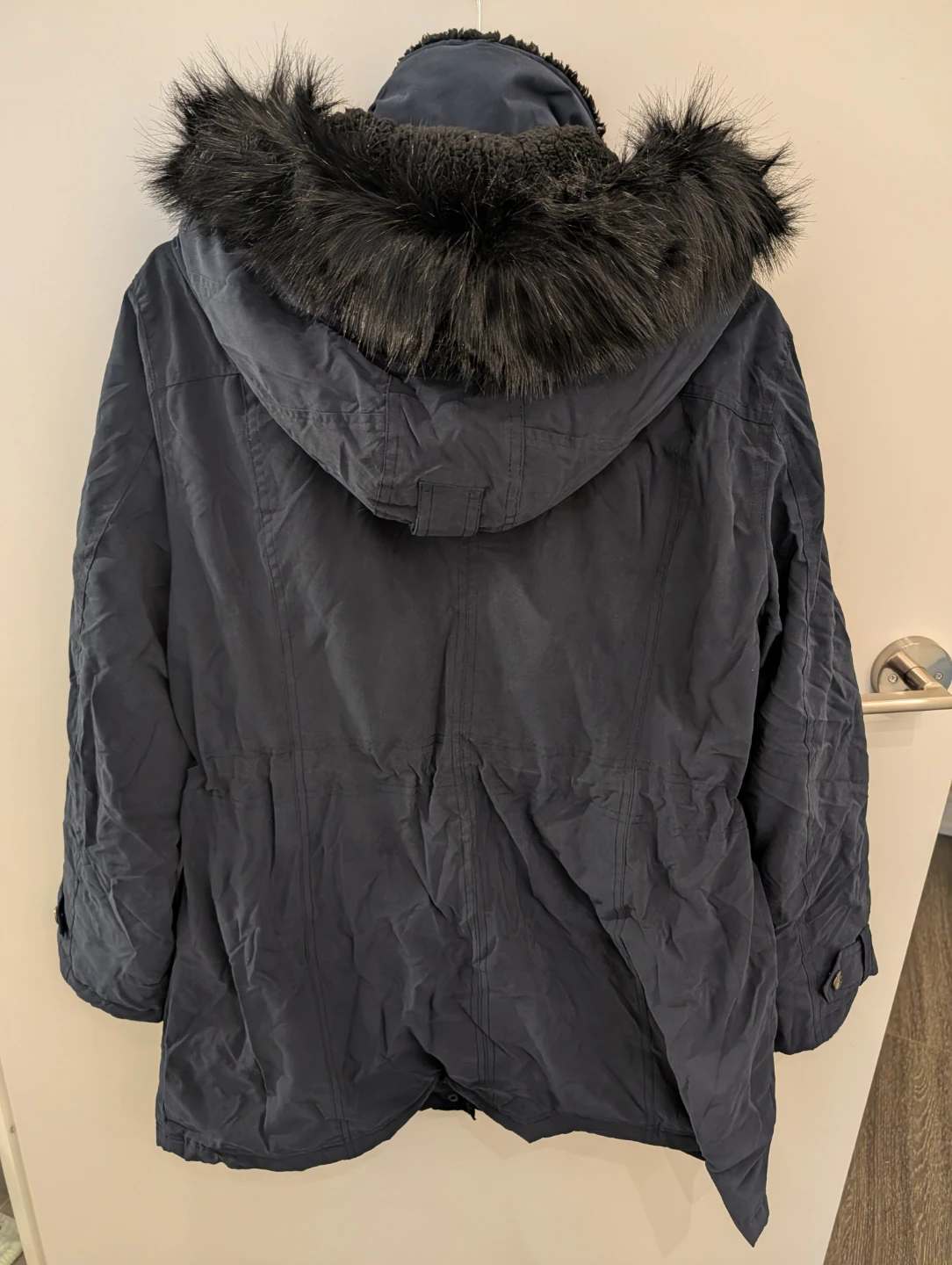 This DKNY parka is navy blue with a faux fur-lined hood. A warm winter jacket with multiple pockets.