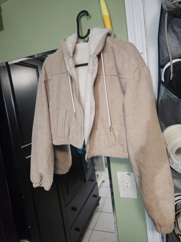Cozy up in this corduroy jacket featuring a soft sherpa lining! It's a stylish and comfortable piece, perfect for adding a touch of warmth to your outfit. The jacket has a hood and a zip-up front, making it easy to layer. It's in great condition and ready for a new home!