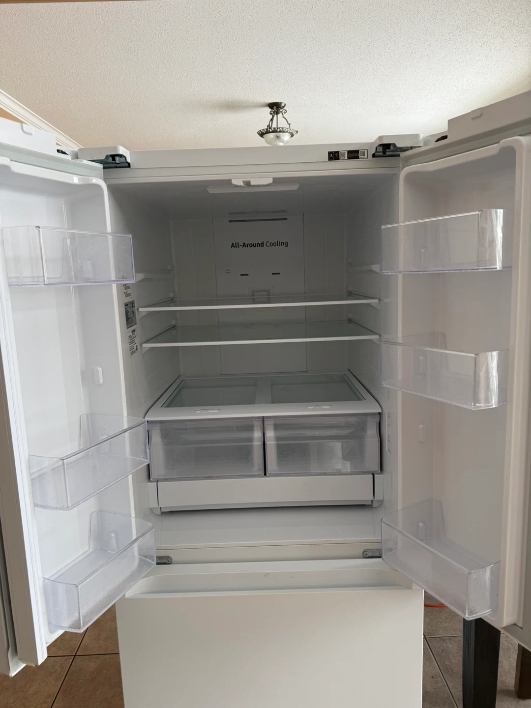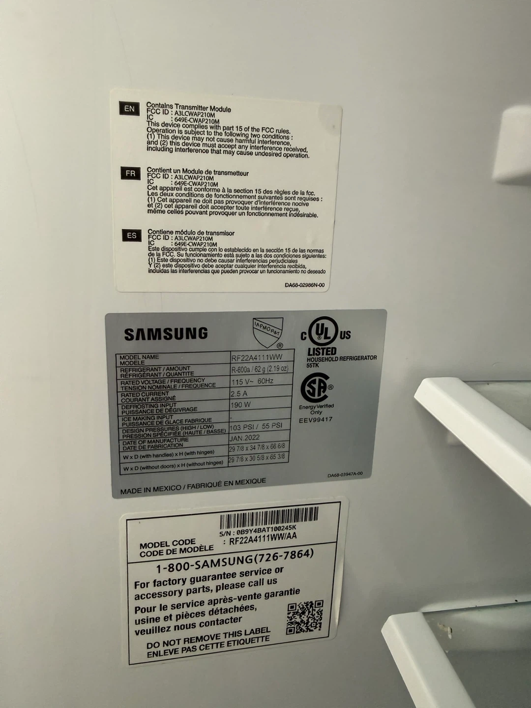 White Samsung French door refrigerator. It's a 22 cu. ft. model with "All-Around Cooling" and ice making function. Manufactured January 2022. Dimensions are 70 7/8" H x 29 7/8" W x 34 7/8" D.