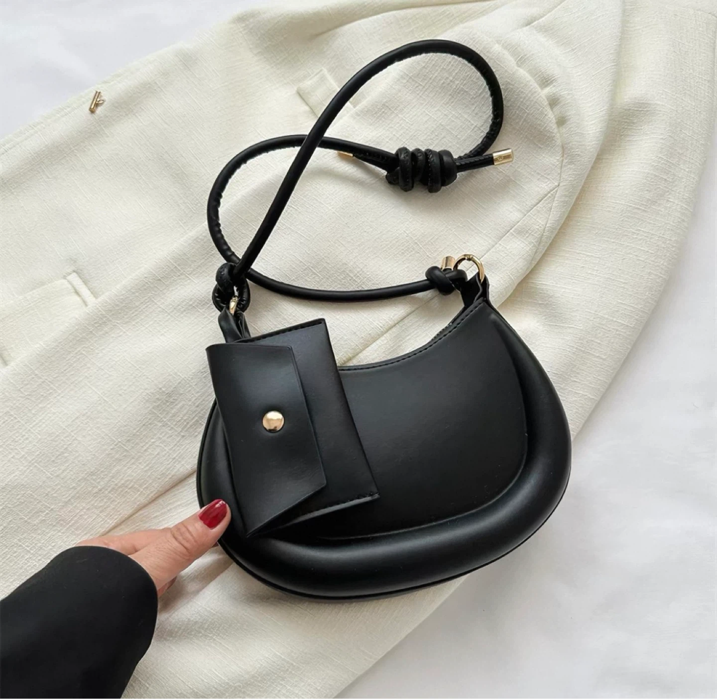 This black shoulder bag features a chic crescent shape and a unique knotted strap detail. It comes with a detachable small coin pouch, perfect for your essentials. Faux leather material.