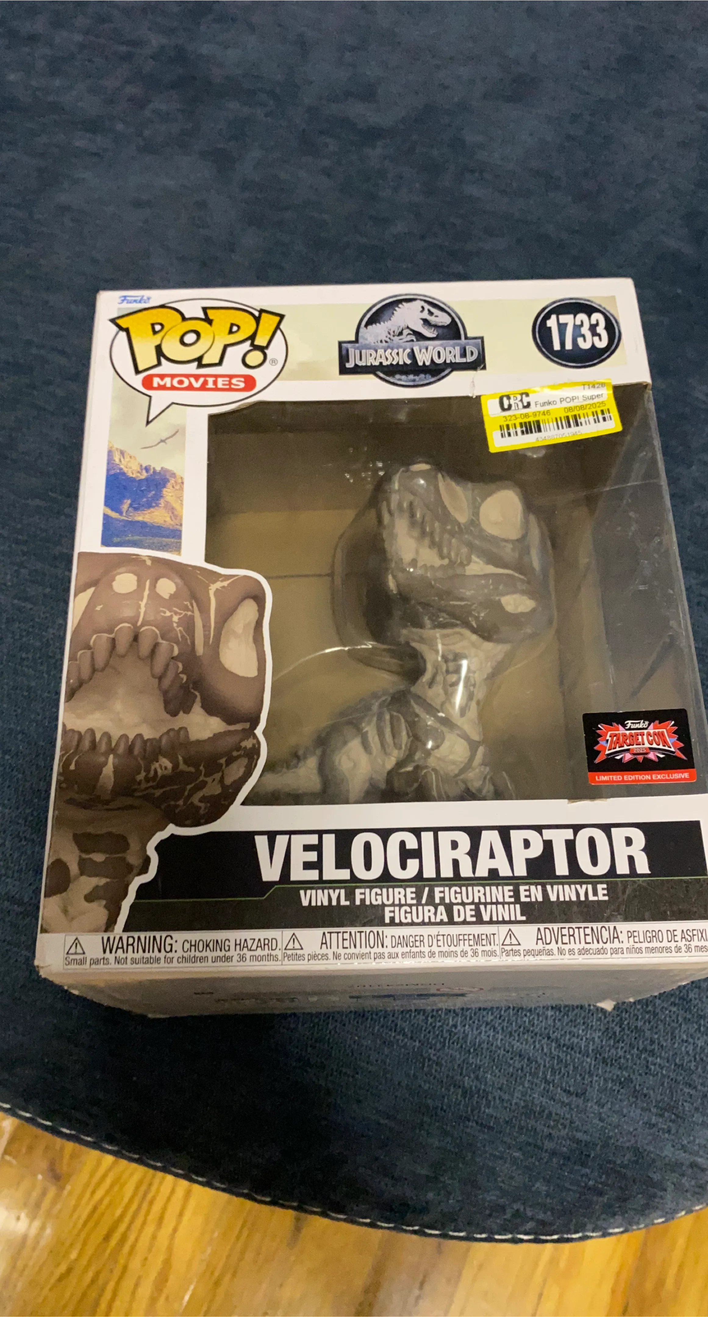 This is a Funko Pop! Movies vinyl figure of the Velociraptor from Jurassic World. It's a limited edition exclusive from Target Con 2025. The figure is in its original packaging.