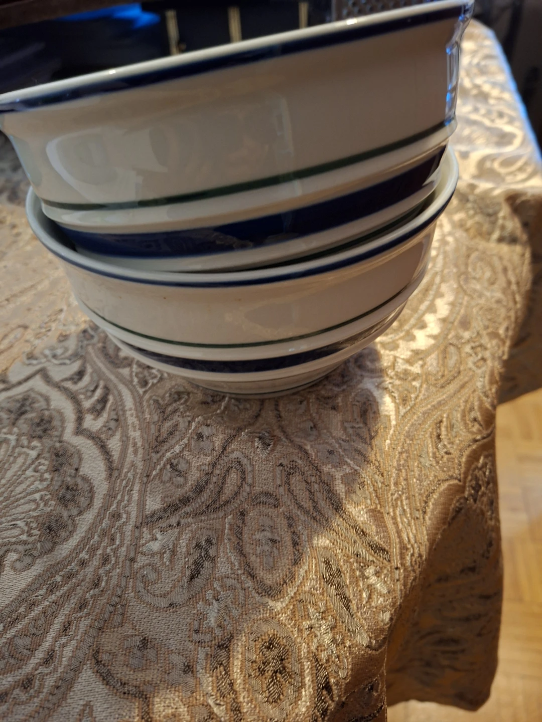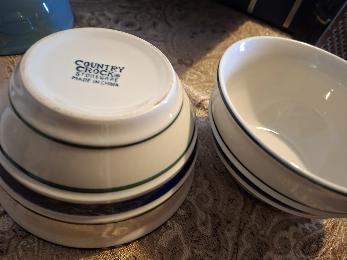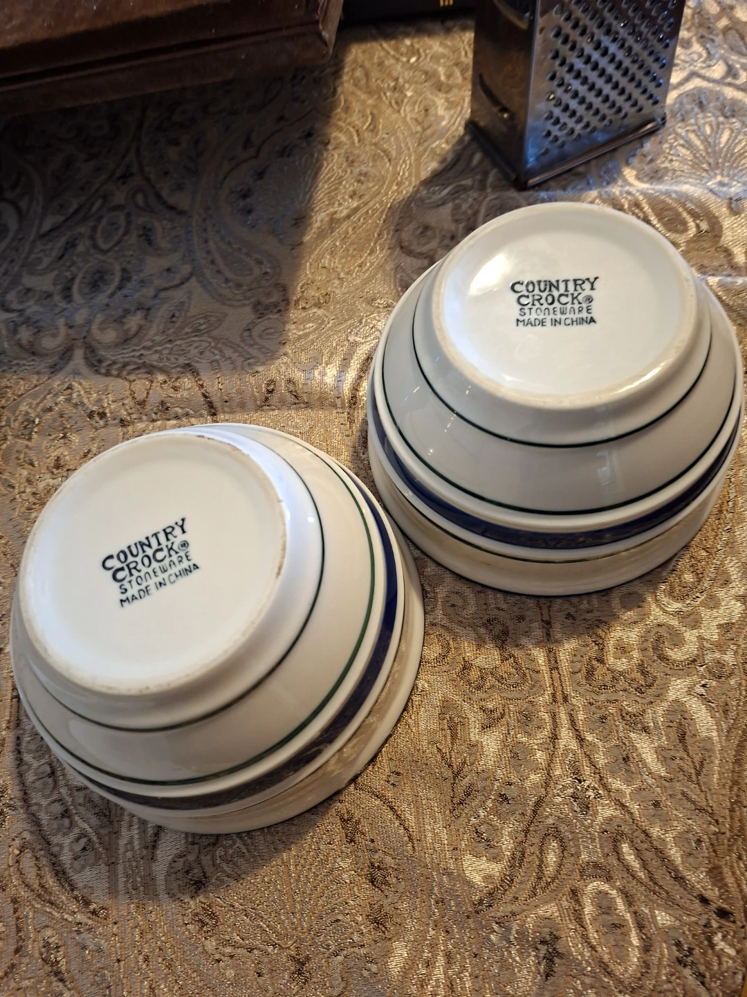 Selling a set of three Country Crock stoneware bowls. These bowls are in great condition and feature a classic design with blue and green stripes. Perfect for adding a touch of vintage charm to your kitchen!