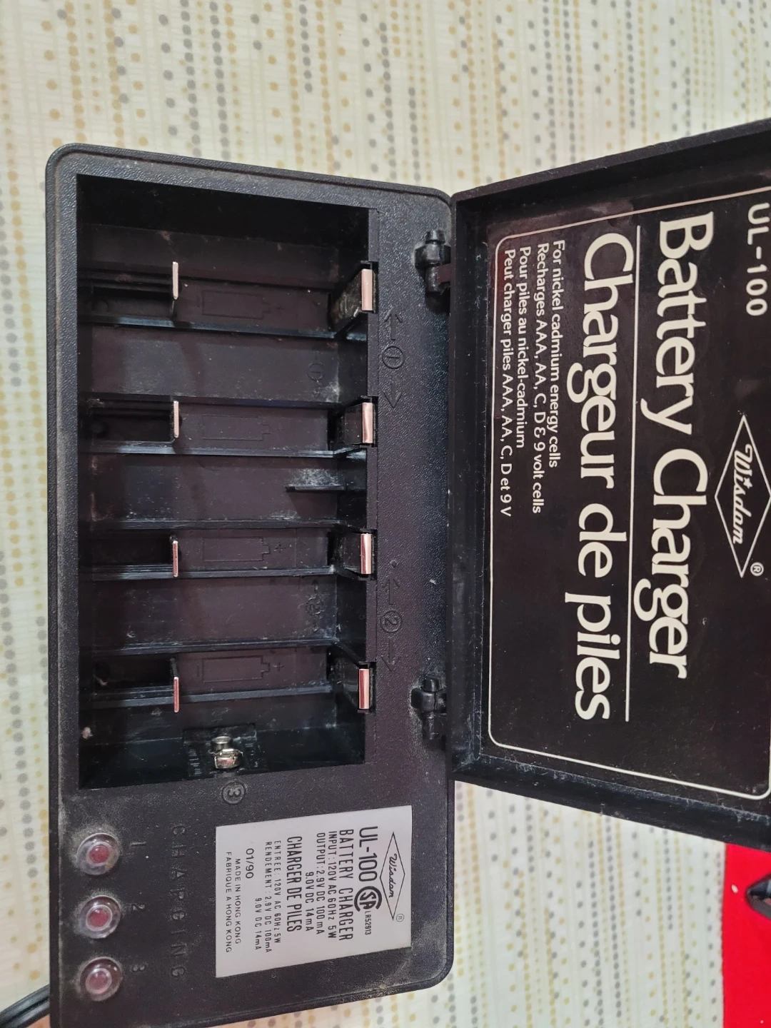 Wisdom UL-100 battery charger for nickel-cadmium A, AA, C, D & 9 volt cells. Input 120V AC 60Hz 5W. Output DC 14mA. Charges 4 batteries at once. Made in Hong Kong.