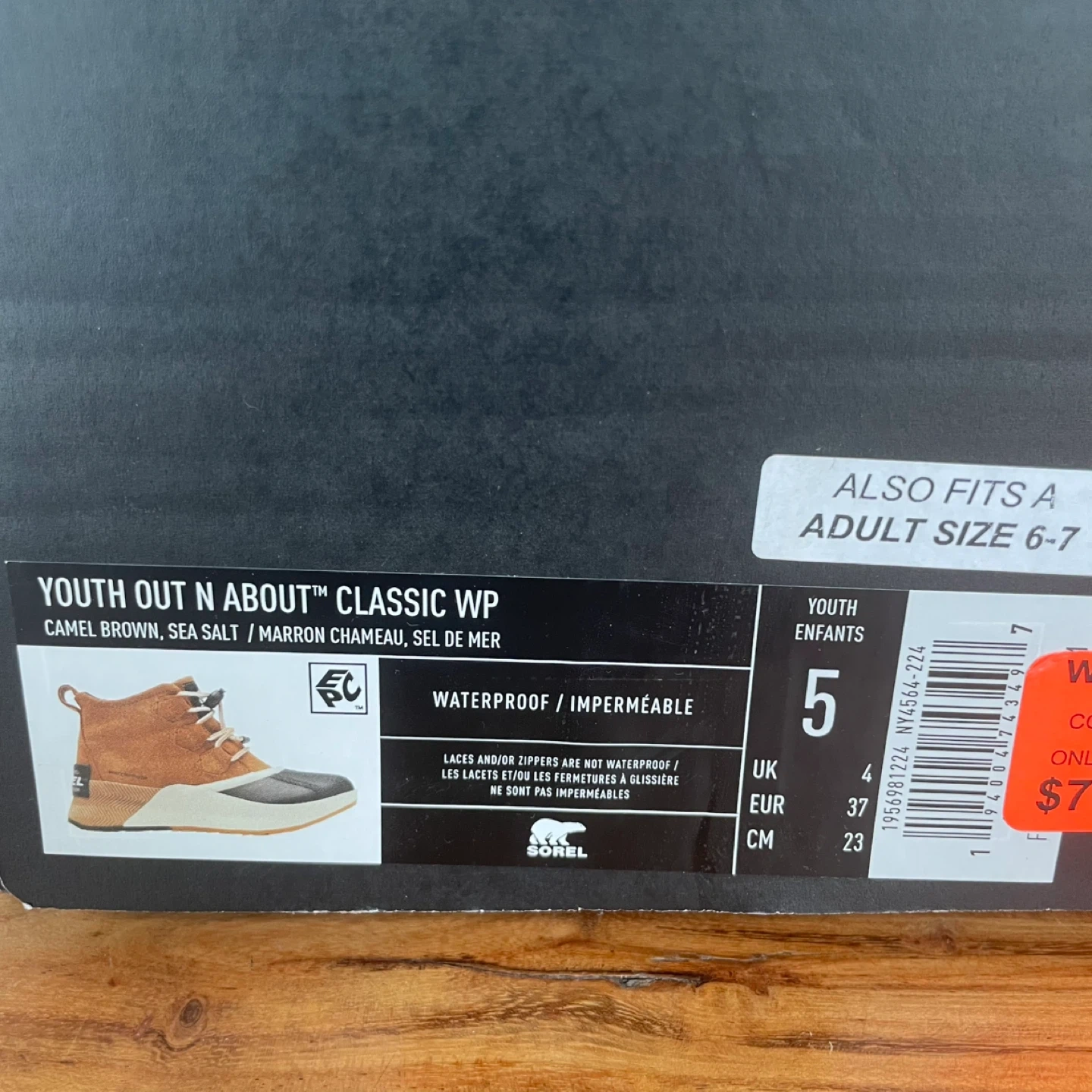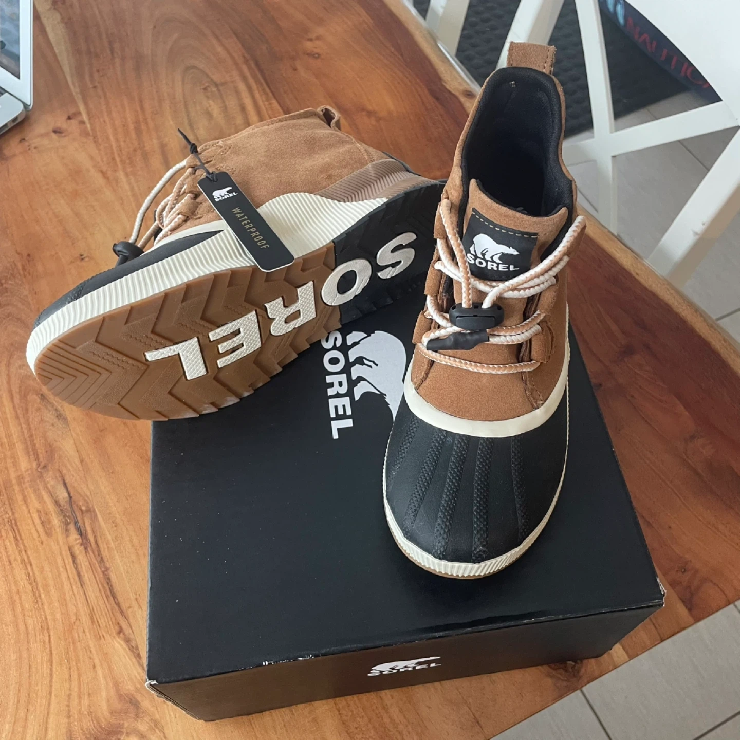 NEW NEVER WORN waterproof boots in camel brown. Suede and rubber construction with toggle laces. Includes original box. Fits Youth 5 or Women’s 6/-7.