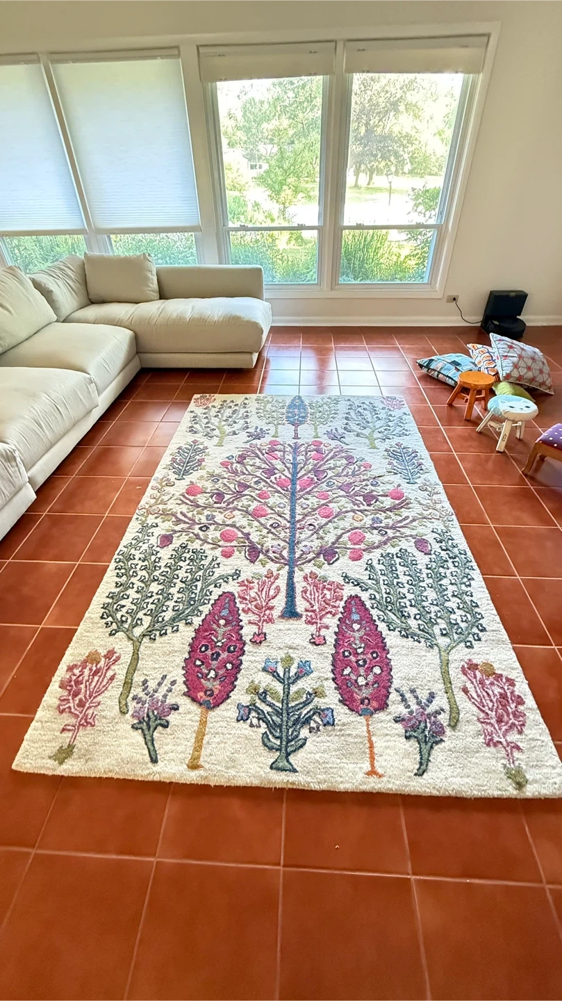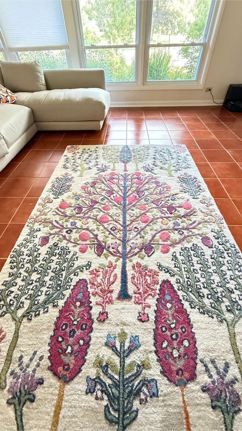 Bold and beautiful hand-tufted wool rug from Anthropologie. This is the Arden Rug, known for its rich tree-of-life design, vibrant color palette, and plush texture.