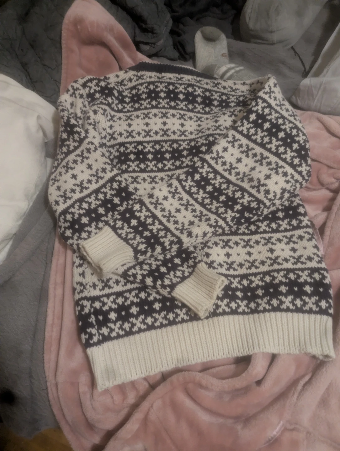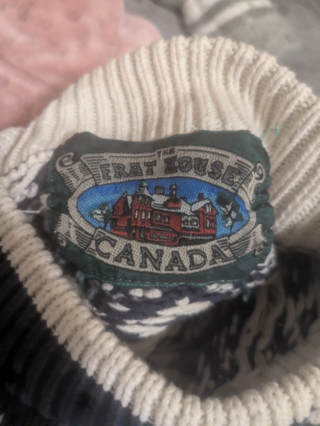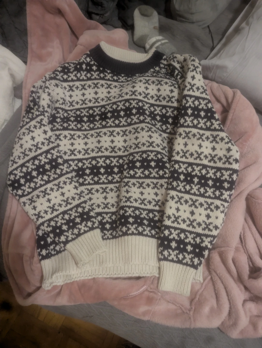 Cozy knit sweater with a classic Fair Isle pattern. Features a crew neck and ribbed cuffs and hem. Made in Canada.