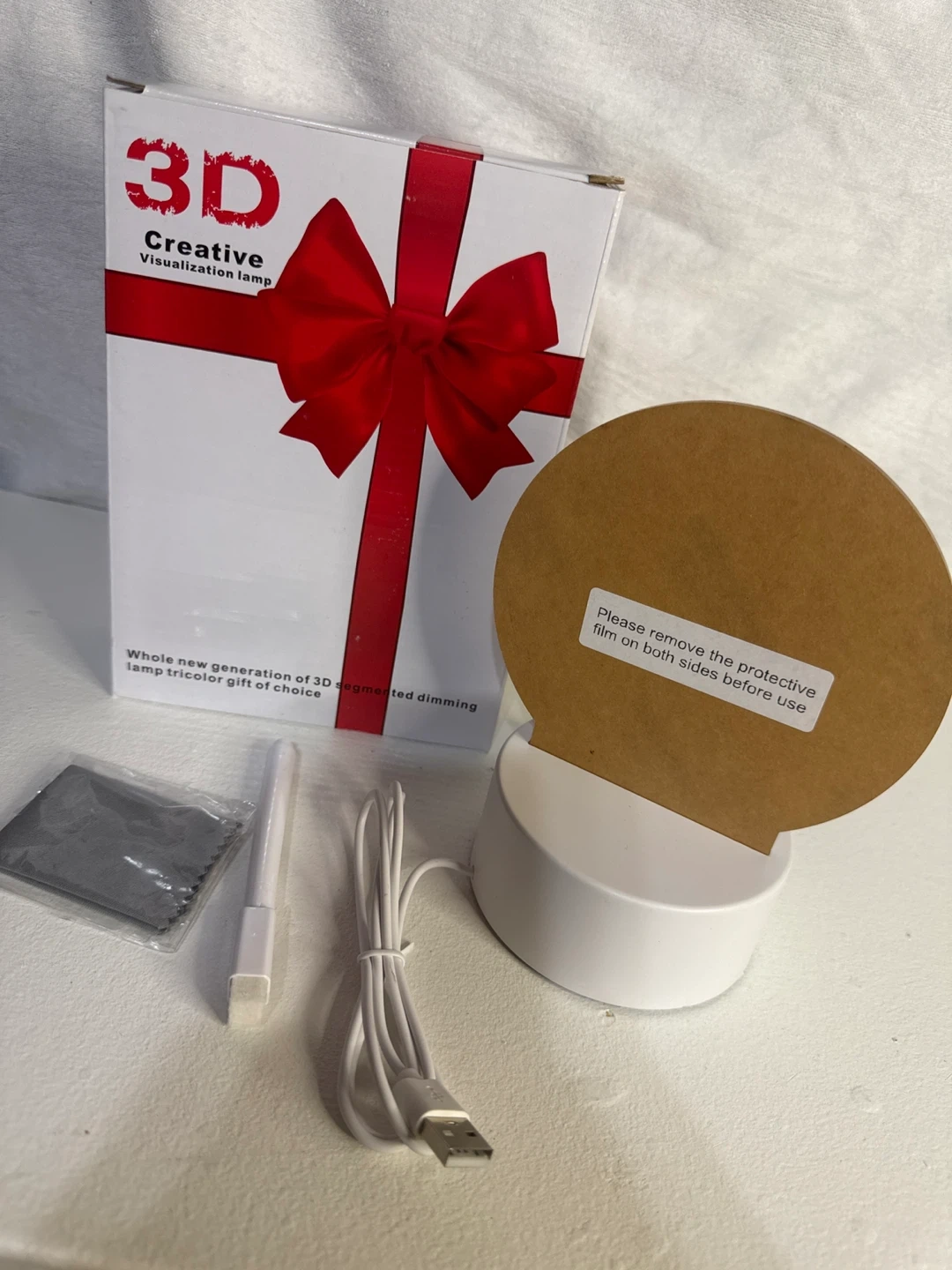 This is a 3D creative visualization lamp. It comes with a USB cable and a cleaning cloth. The circular display panel has a note to remove protective film. It's a unique gift for someone!