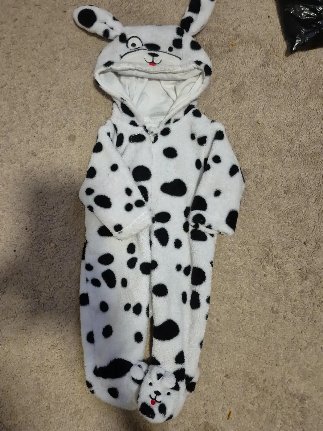 Cozy white fleece sleepsuit with a black Dalmatian print and attached hood featuring dog ears. It has a zipper front closure and footies with a cute dog face design. This sleepsuit is made for comfort and fun!