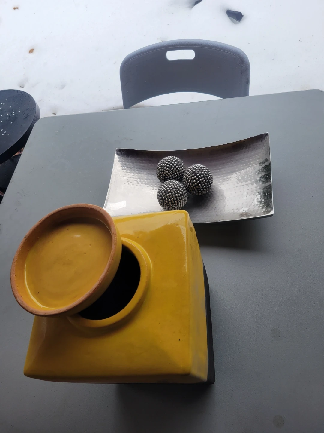 Decorative set including a hammered silver tray, a large frosted glass vase, a smaller clear glass vase, a round glass stoppered bottle, and a yellow ceramic lidded jar. Also includes three decorative spheres with a beaded texture.
