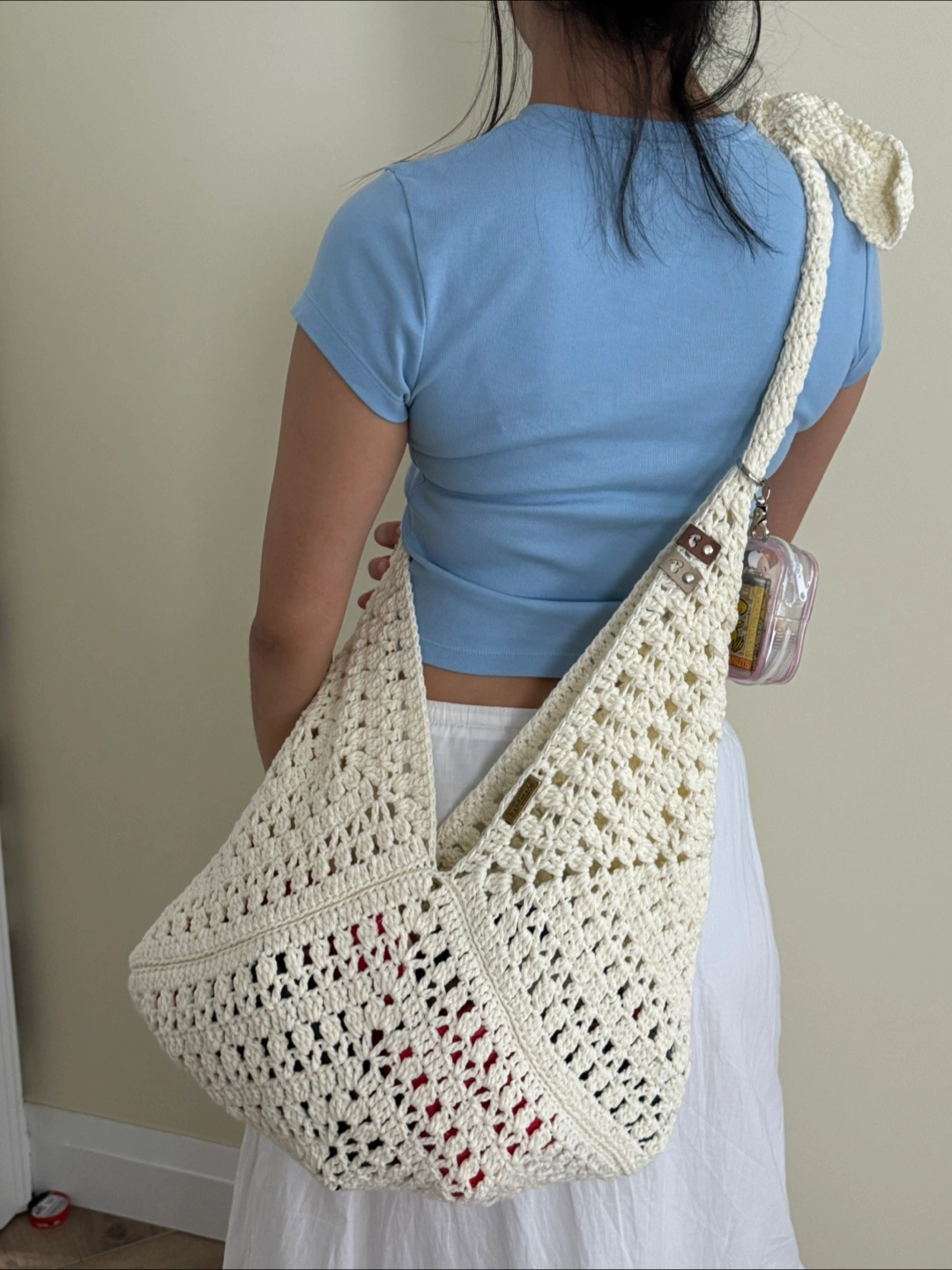 Cream-coloured, handmade crochet bag. Features a long strap with a knot detail that can be adjusted to custom length.
