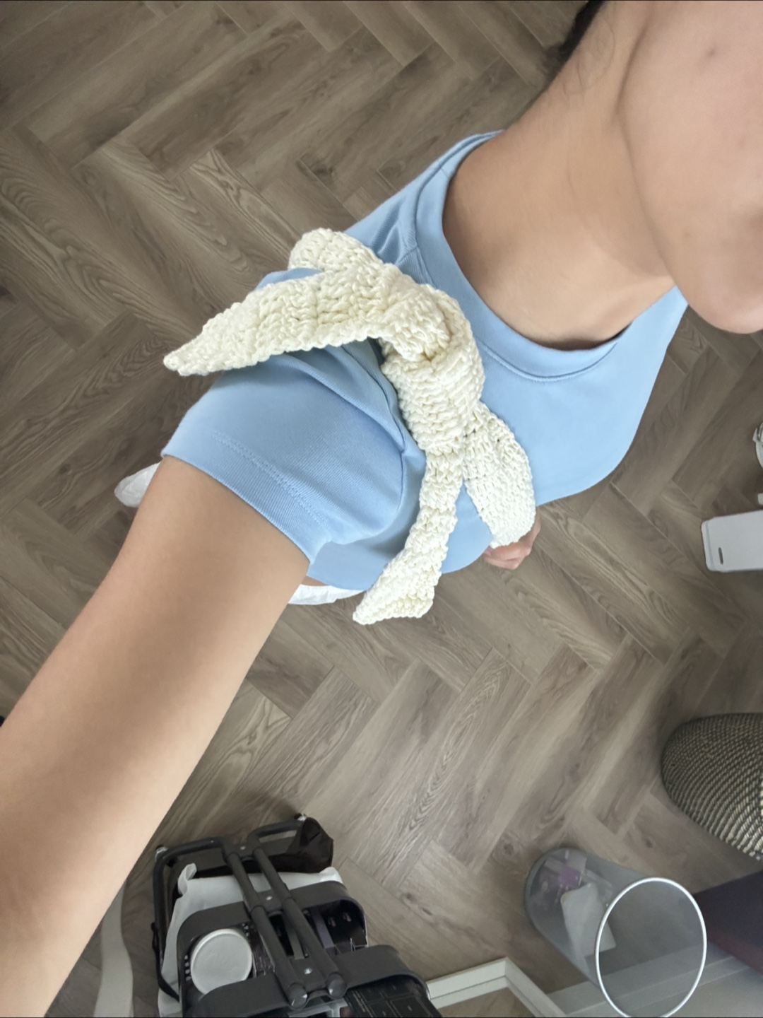 Cream-coloured, handmade crochet bag. Features a long strap with a knot detail that can be adjusted to custom length.