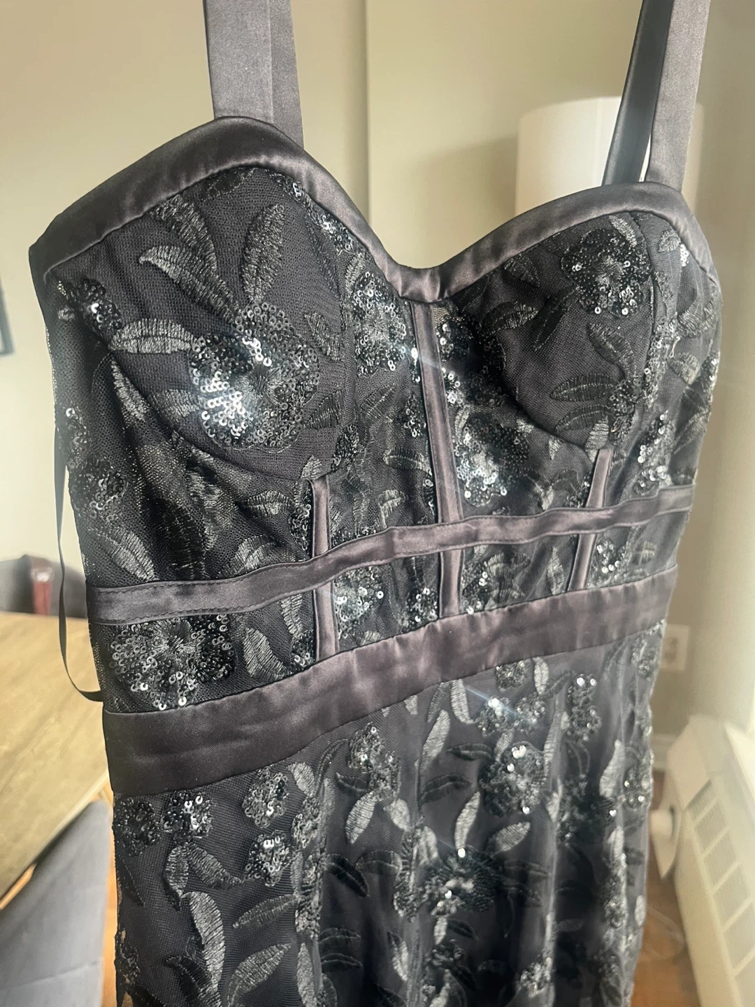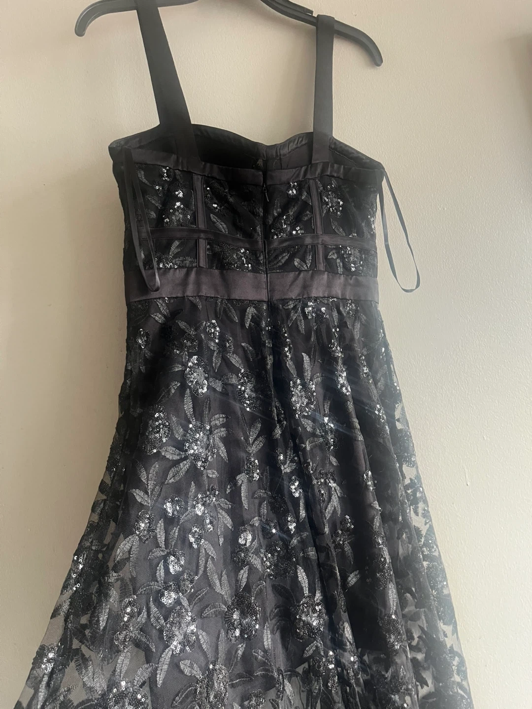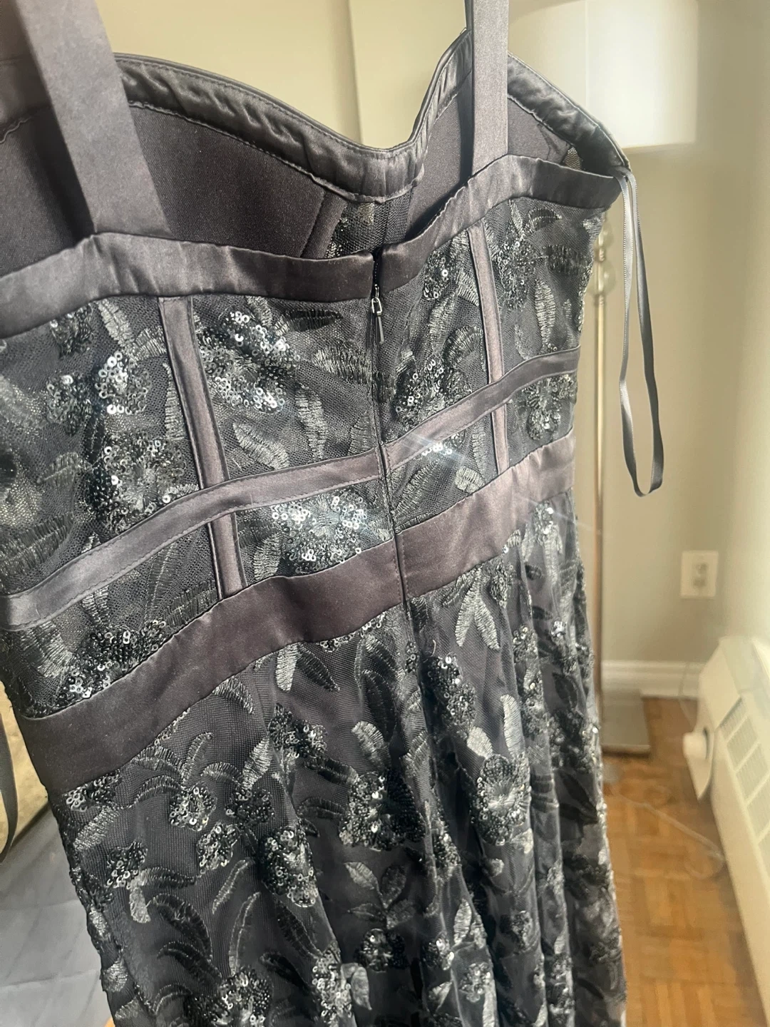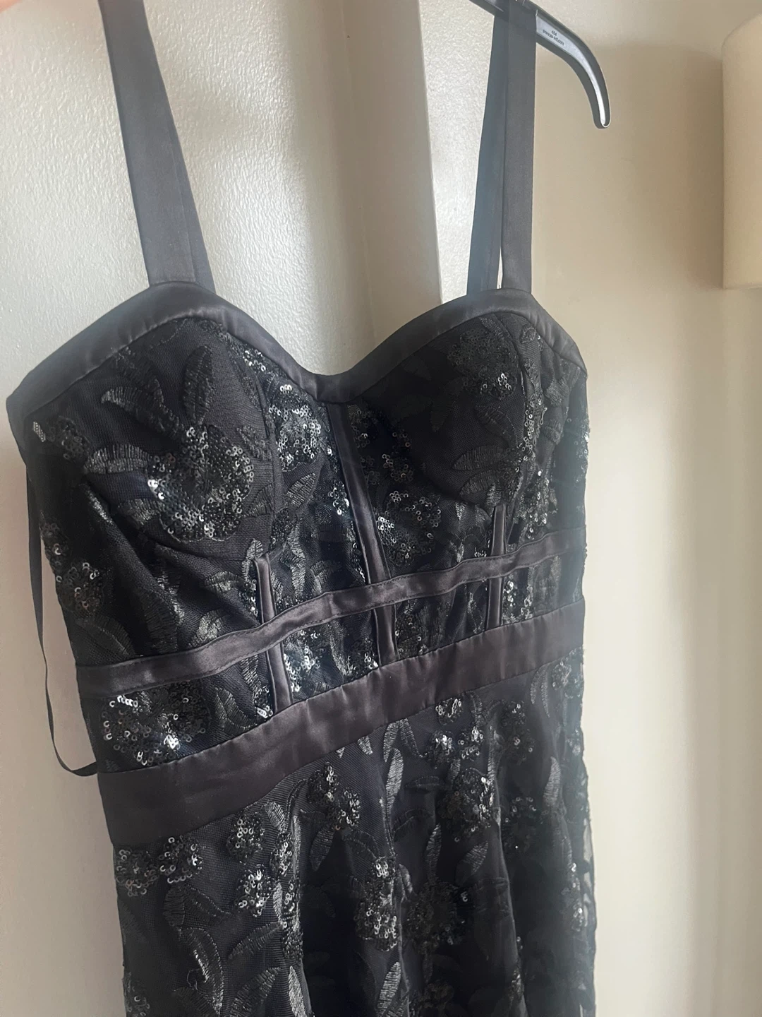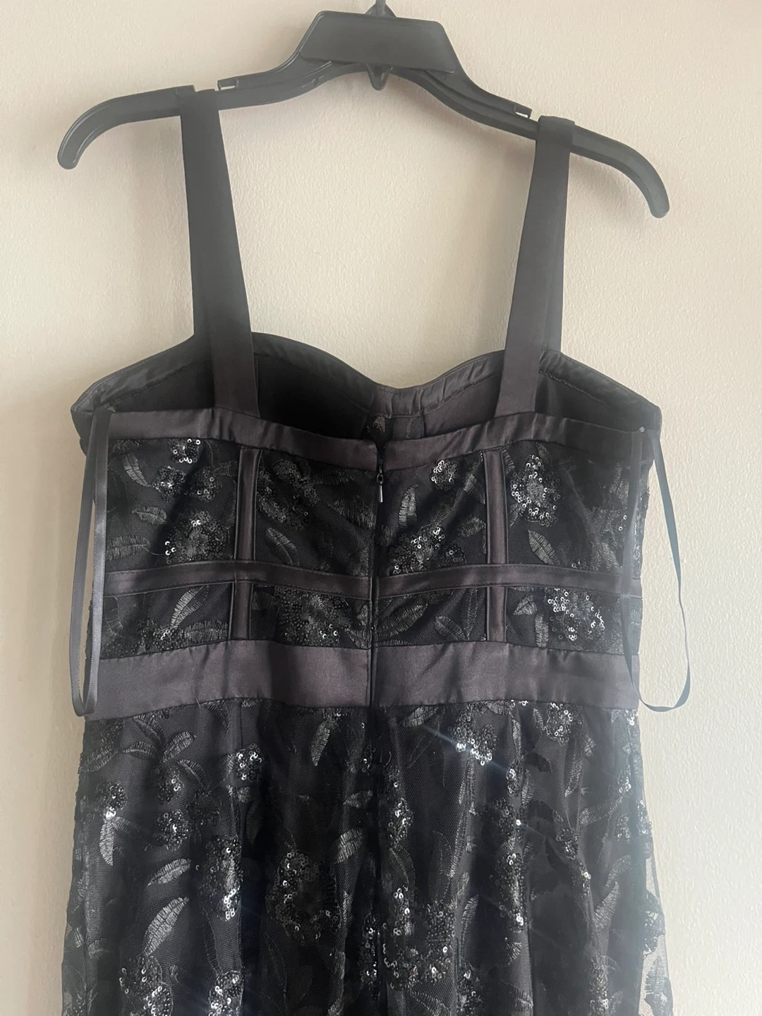 This black party dress features a sweetheart neckline and sequin lace detailing. It has a zip-up back closure. Perfect for a formal event or a night out!
