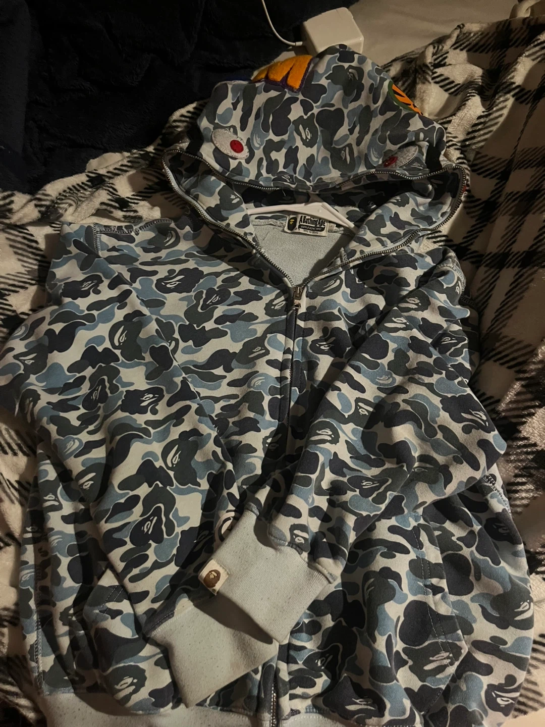 Selling a BAPE (A Bathing Ape) camo hoodie in size L. The hoodie features a cool blue and grey camo pattern. Great for streetwear enthusiasts! Open to trades for other bape stuff