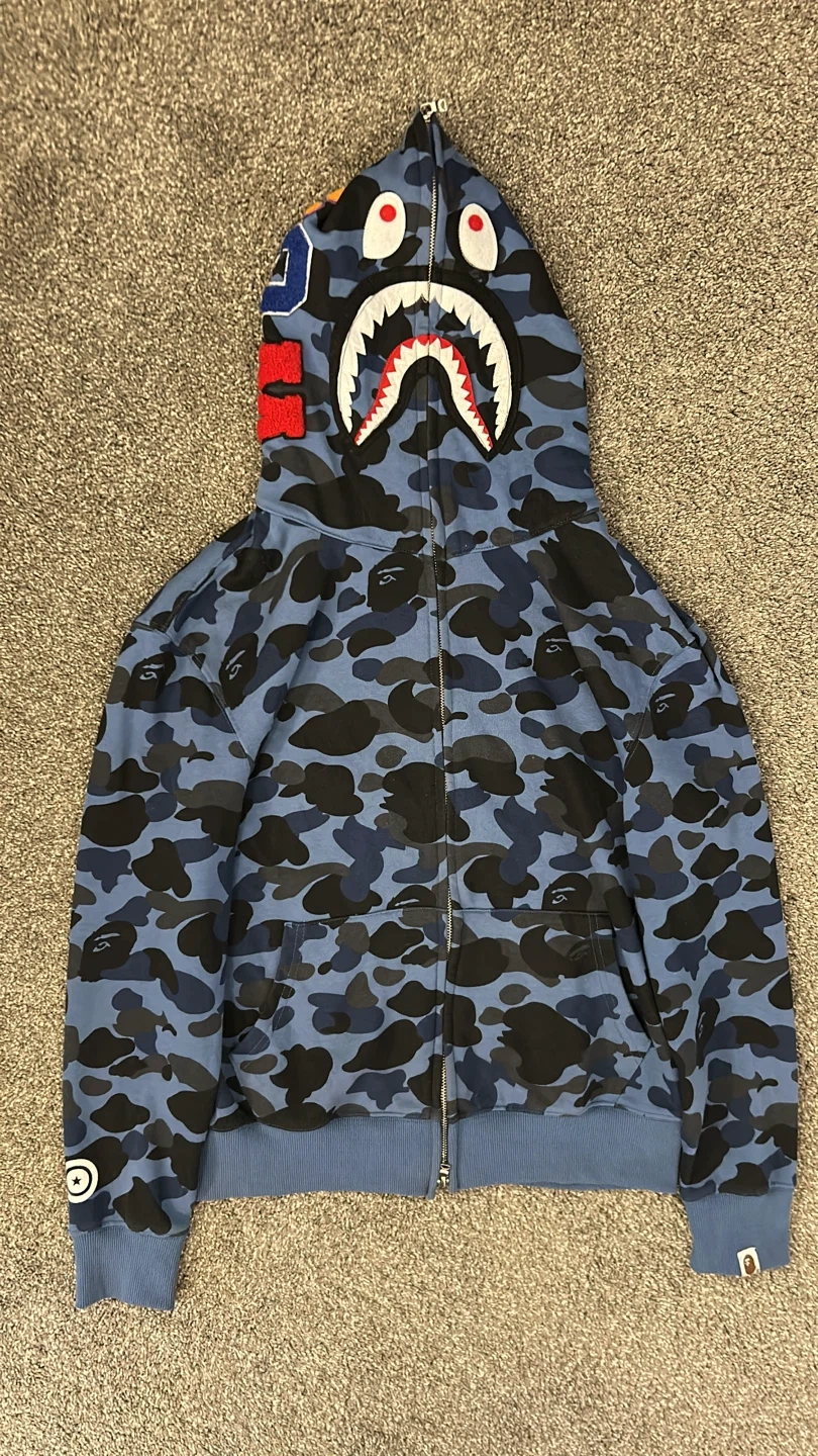 10Selling a BAPE (A Bathing Ape) shark hoodie in a cool blue camo pattern. It's a size medium and in great condition. The iconic shark design on the hood makes it a standout piece!