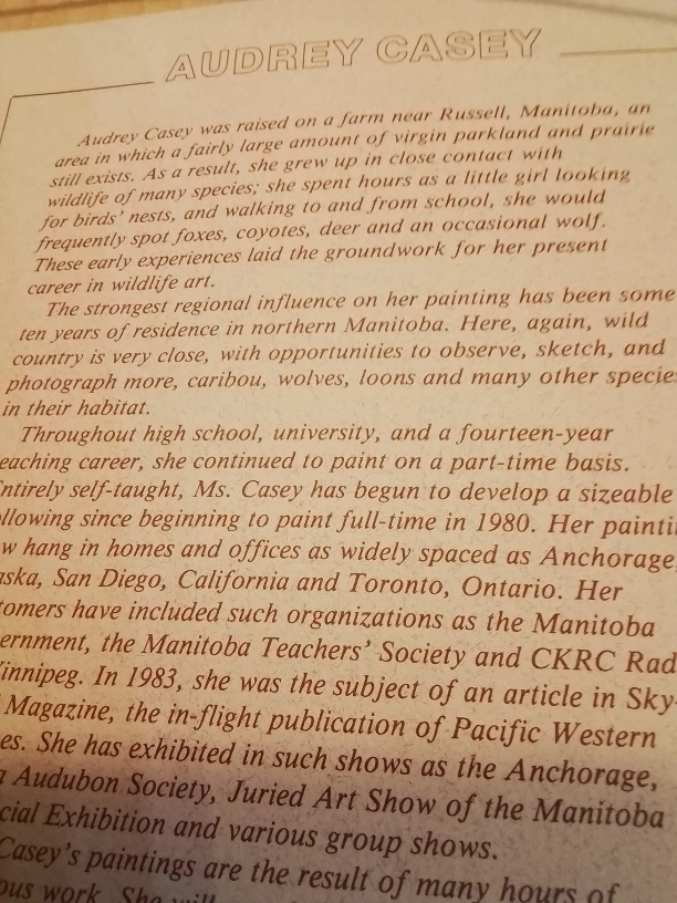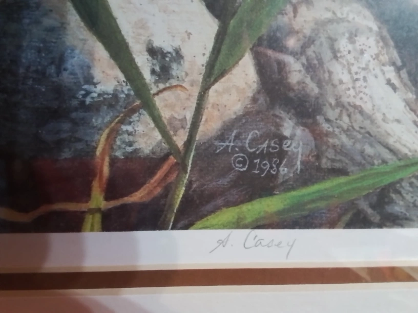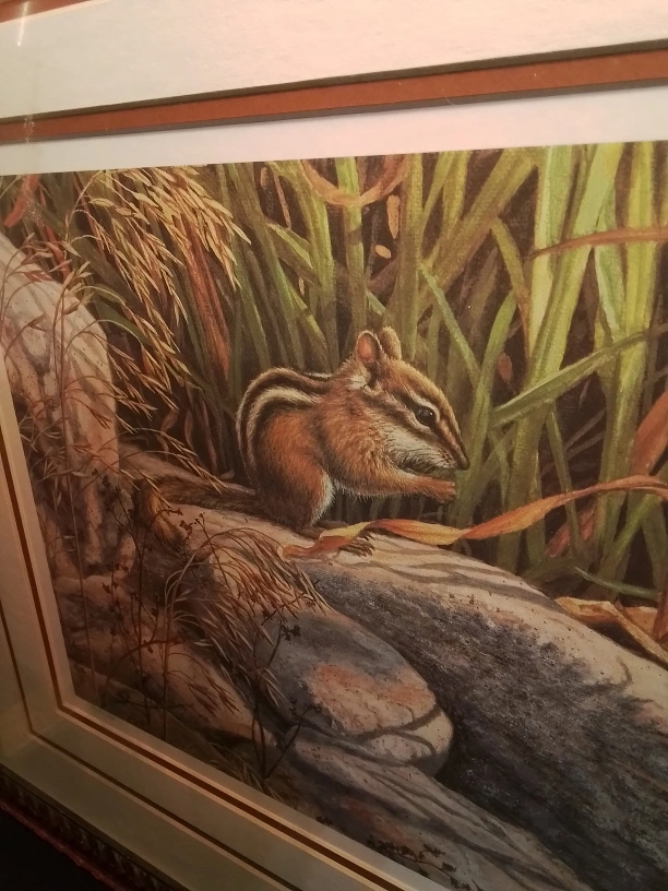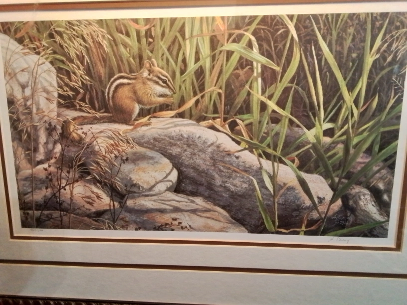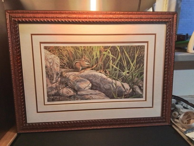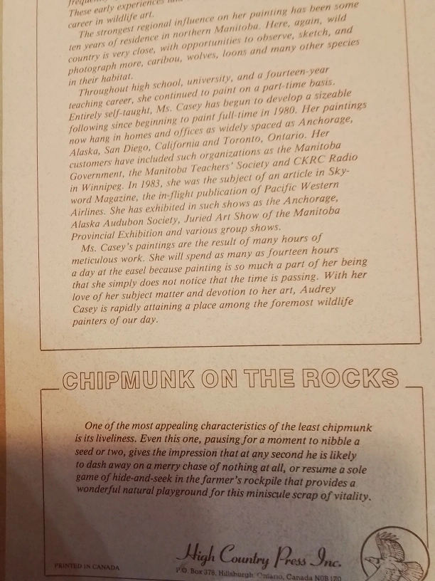 114Audrey Casey Print "Chipmunk on the Rocks" 1986 This is a framed and signed print by Manitoba artist Audrey Casey, titled "Chipmunk on the Rocks," numbered 448/500, and signed and dated 1986. It is in good condition. * Artist: Audrey Casey * Title: Chipmunk on the Rocks * Year: 1986 * Edition: 448/500 Measurements 29.5 x 21.5 This piece has been appraised at $200-$300 CAD. I am asking $250, or best offer. If the ad is still up, then yes, it is still available. Don't miss out! Pickup at Yonge Street and Steeles Avenue