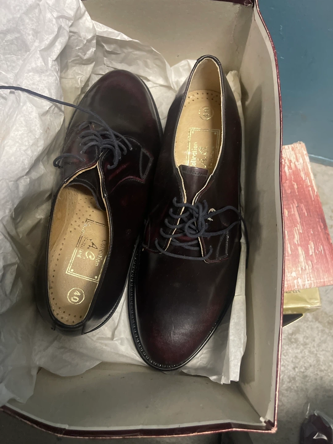 Selling a pair of A.E. Collection dress shoes in a nice burgundy colour. They are a size 40 and come with the original box! Perfect for any formal occasion or to dress up your everyday look