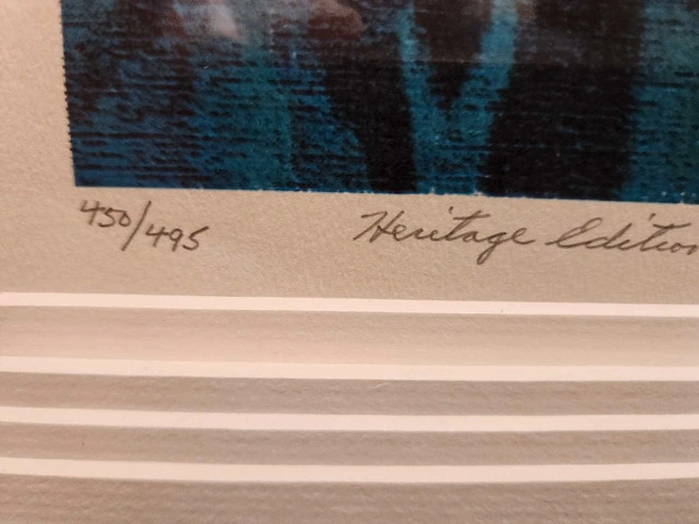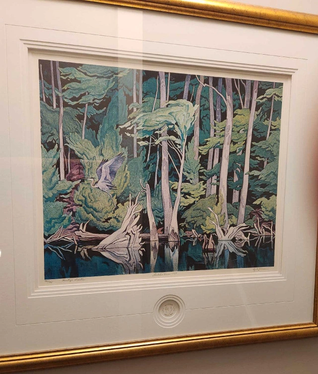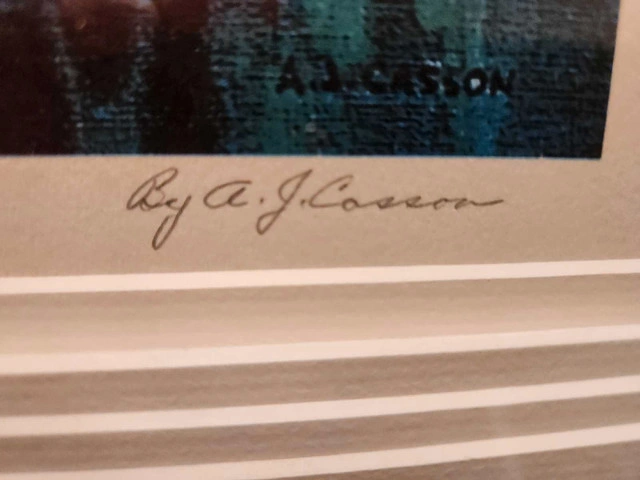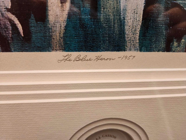 91This Heritage Edition A.J. Casson 'The Blue Heron - 1957' print is a beautiful piece ready to enhance any space. This print is number 450 of 495. The print is signed and includes an estate seal. The condition is very good, with professional framing. Here are some details: * Artist: - A.J. Casson * Title: - The Blue Heron - 1957 * Edition: - Heritage Edition, 450/495 * Features: - Signed, Estate Seal * Framing: - Professionally framed 35" x 33" I am pricing this at $350 due to its excellent condition and professional framing.