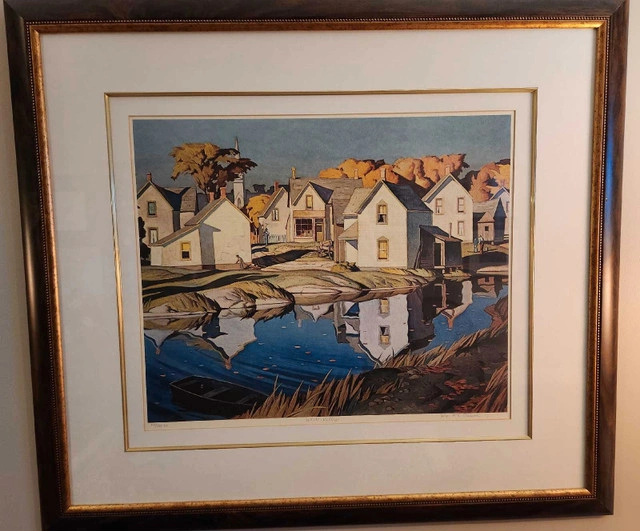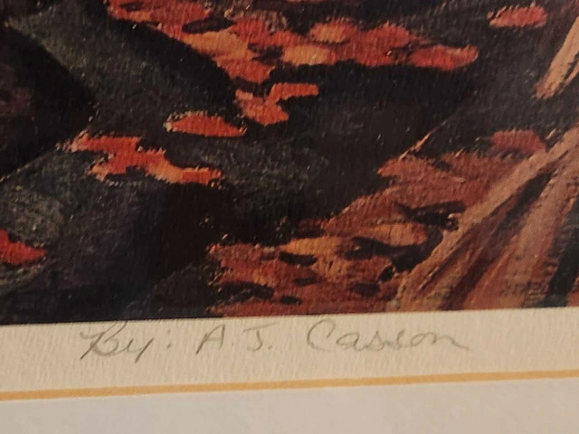 91A.J. Casson 'White Village' print, numbered 148 of 495, beautifully framed and ready to hang. The print captures a serene village scene, reflecting Casson's signature style and vibrant use of colour. This piece has been previously enjoyed, it remains in good condition, showcasing the timeless appeal of Casson's work. * Artist: A.J. Casson * Title: White Village * Edition: 148/495 * Frame 31" x 36" I've had a peek at what similar A.J. Casson prints are going for, and based on Kijiji listings and other art marketplaces, a reasonable price for this piece would be between $150 and $300 CAD. Considering the condition and the edition number, I've priced it fairly. If this ad is still up, the print is available.