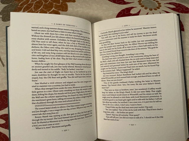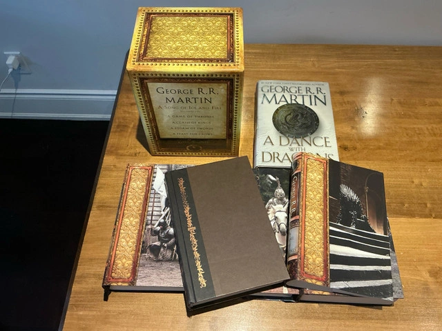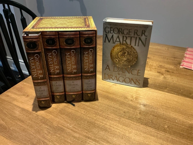 5George R.R. Martin – A Song of Ice and Fire Hardcover Box Set (Books 1–4) + Bonus A Dance with Dragons This is the 2011 Bantam HBO tie-in hardcover box set (ISBN 978-0-307-29213-1), originally released as an Amazon exclusive. It includes the first four volumes of George R.R. Martin’s A Song of Ice and Fire in matching jackets and slipcase: 1. A Game of Thrones 2. A Clash of Kings 3. A Storm of Swords 4. A Feast for Crows Condition is very good overall: the slipcase shows minimal wear; the books are clean and tightly bound. I offer my set for $200 CAD + Bonus: A Dance with Dragons (Book 5, Bantam Books 2011, ISBN 978-0-553-80147-7), 6th printing, also hardcover, in very good condition. This volume was published separately and is not part of the box set. This set is available for pickup only at the Coxwell subway station.
