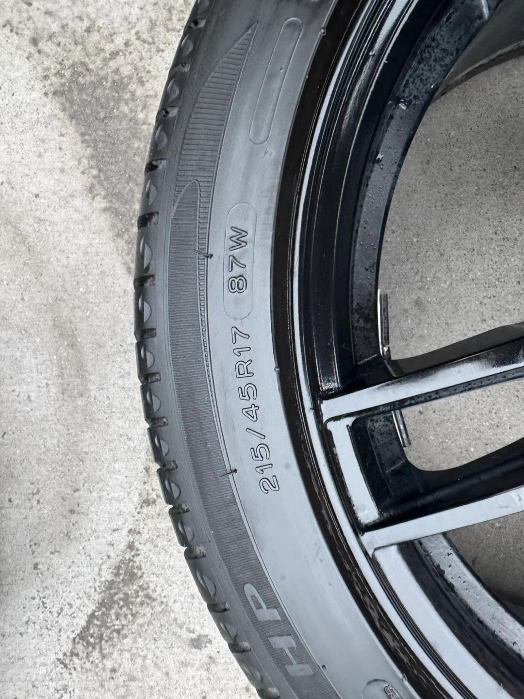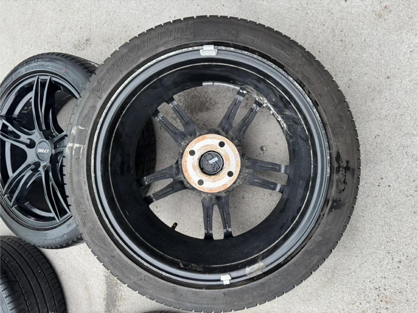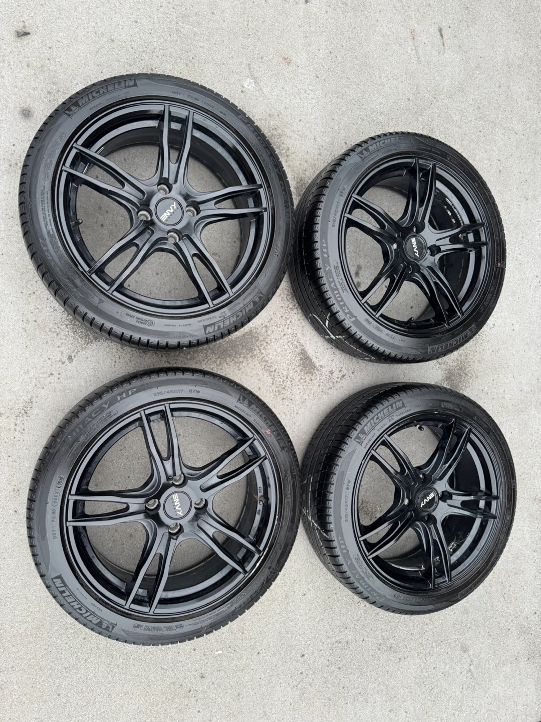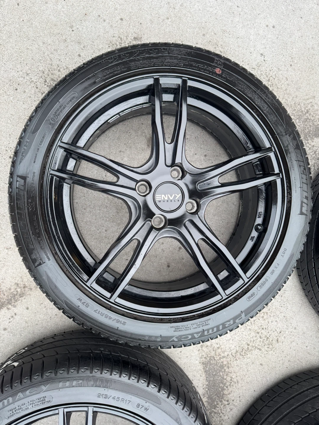 Four shiny black Envy brand alloy rims are for sale. They're 17 inches in size. These wheels are a stylish upgrade for many vehicles. Includes Michelin tires.