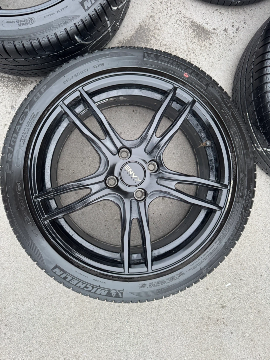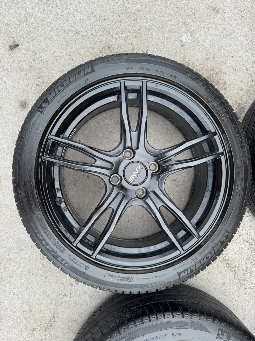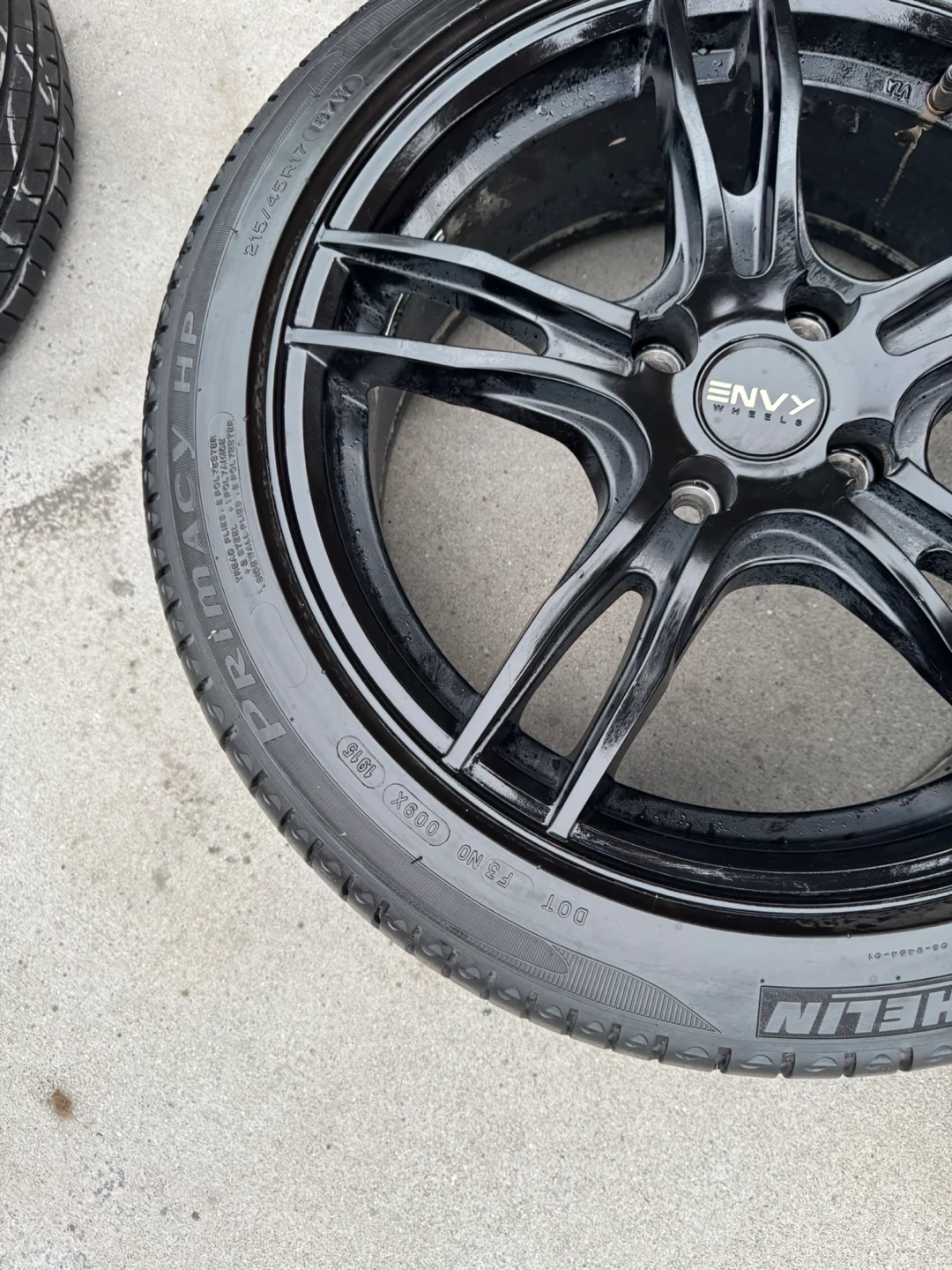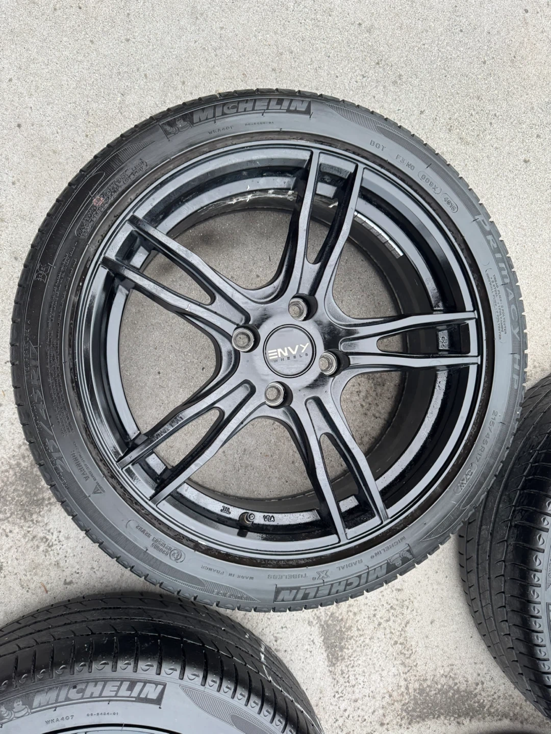 Four shiny black Envy brand alloy rims are for sale. They're 17 inches in size. These wheels are a stylish upgrade for many vehicles. Includes Michelin tires.