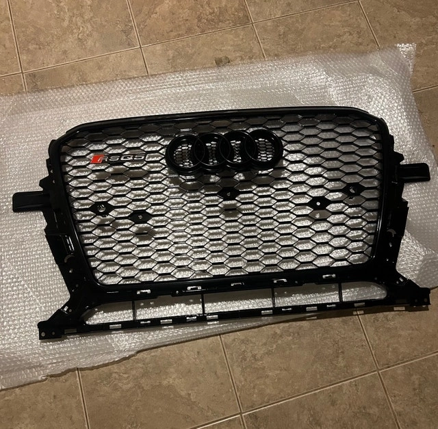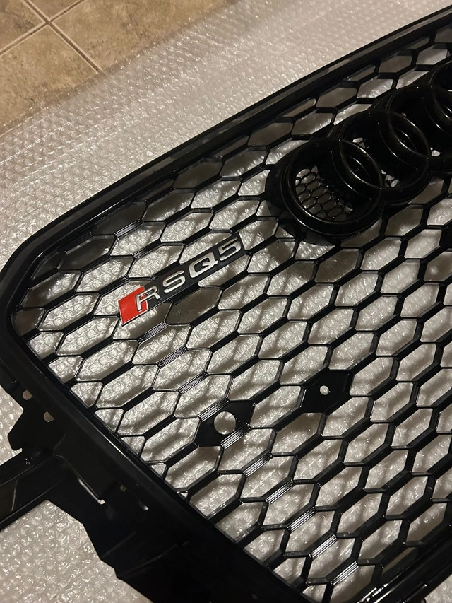 BRAND NEW Audi RS-style honeycomb front grille. Designed to fit a 2013-2017 Audi Q5 or SQ5 (8R Facelift models). Features a glossy black mesh finish with black Audi rings and the RSQ5 badge. Includes parking sensor ports/mounts. Costs minimum $700 + tax + shipping online, so this is an awesome deal!!!