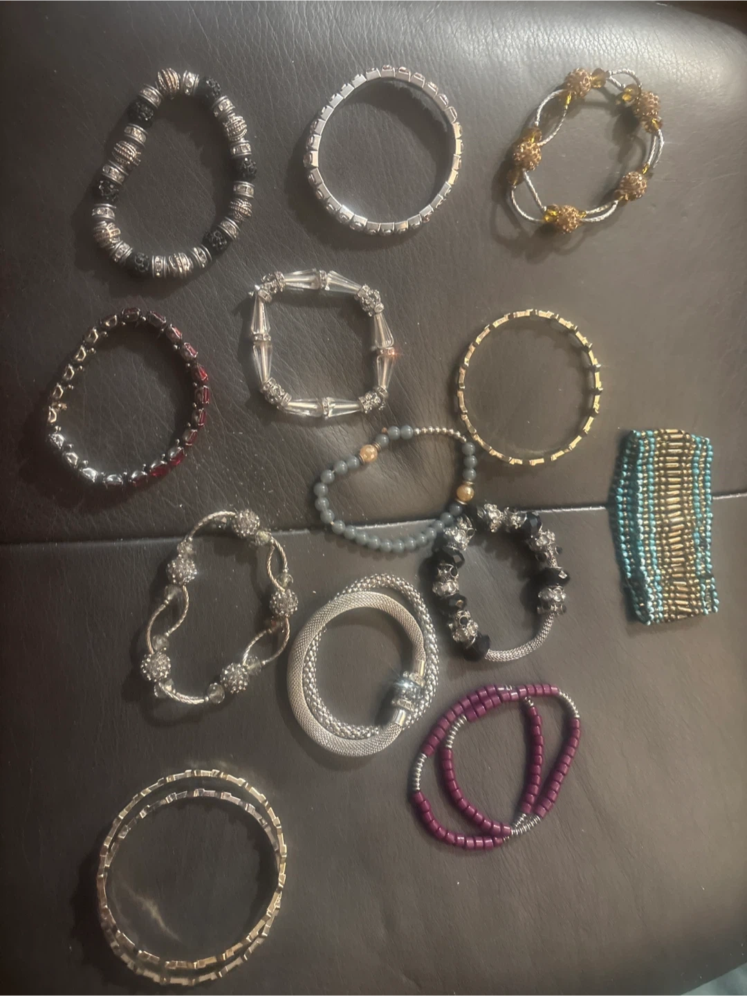 A collection of 11 assorted bracelets for women. Includes beaded, metallic, and decorative styles. Perfect for accessorizing any outfit, these bracelets offer variety and charm.