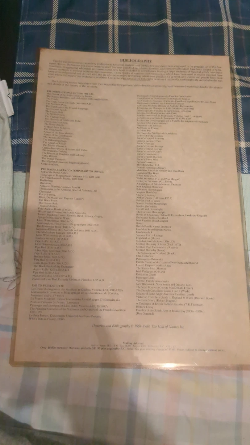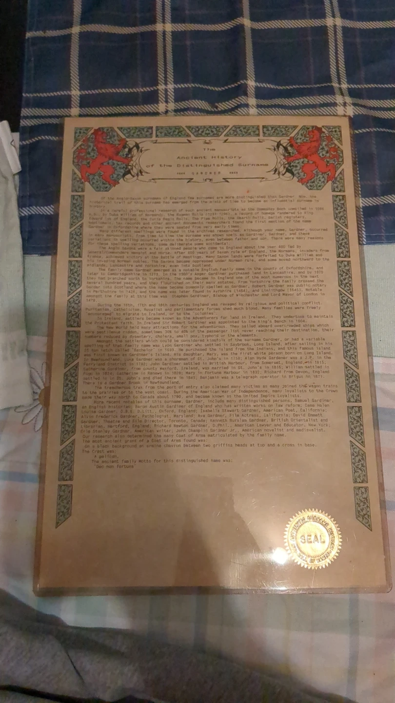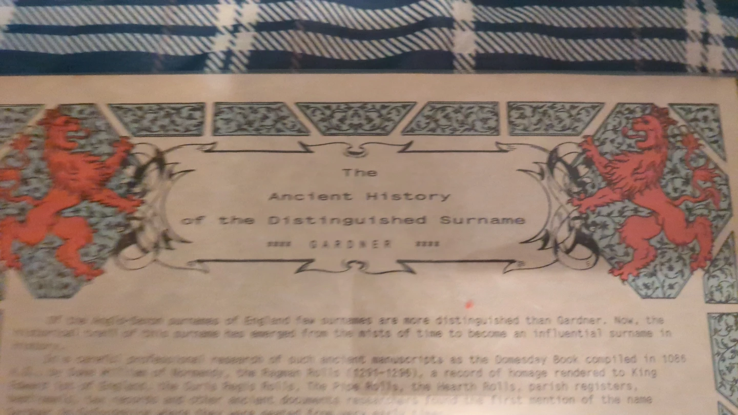 This item is laminated, has details the ancient history of the Gardner surname, compiled from extensive research and ancient manuscripts. It includes information up to 1984. This research is based on over 40,000 Narrator titles.