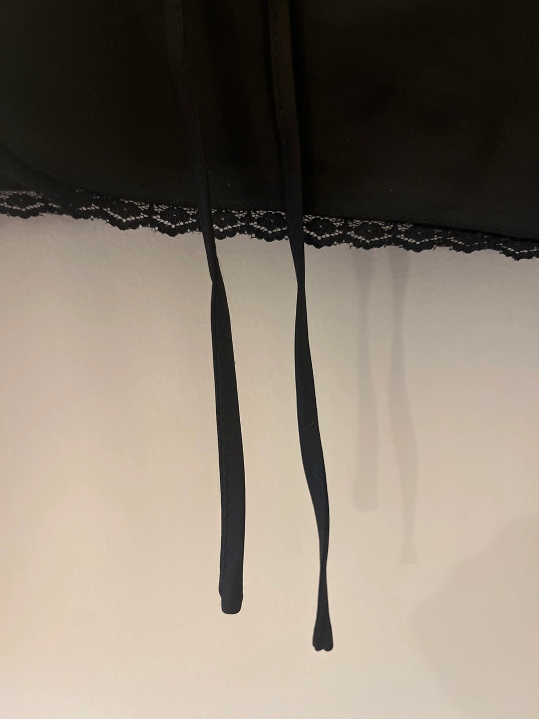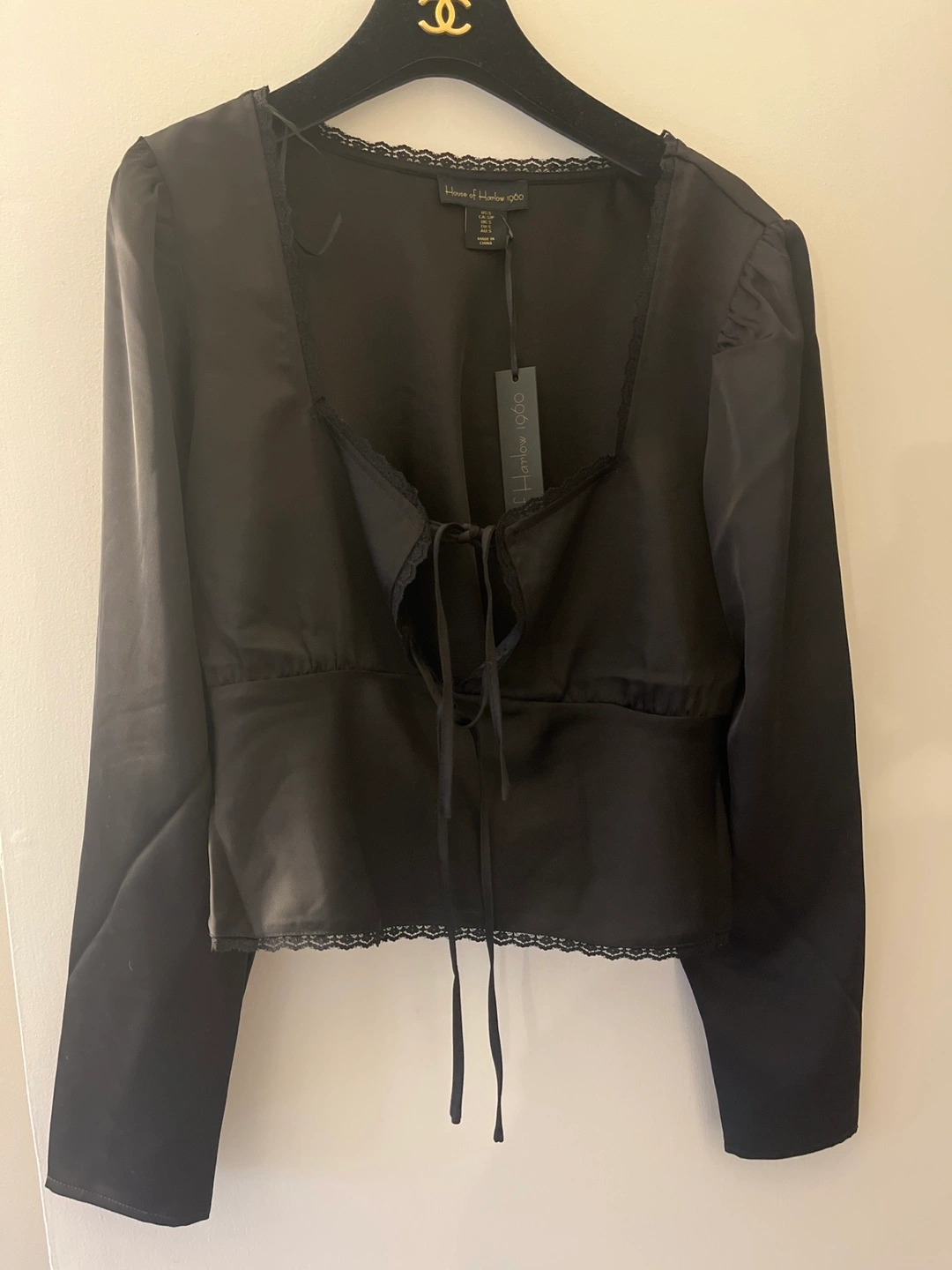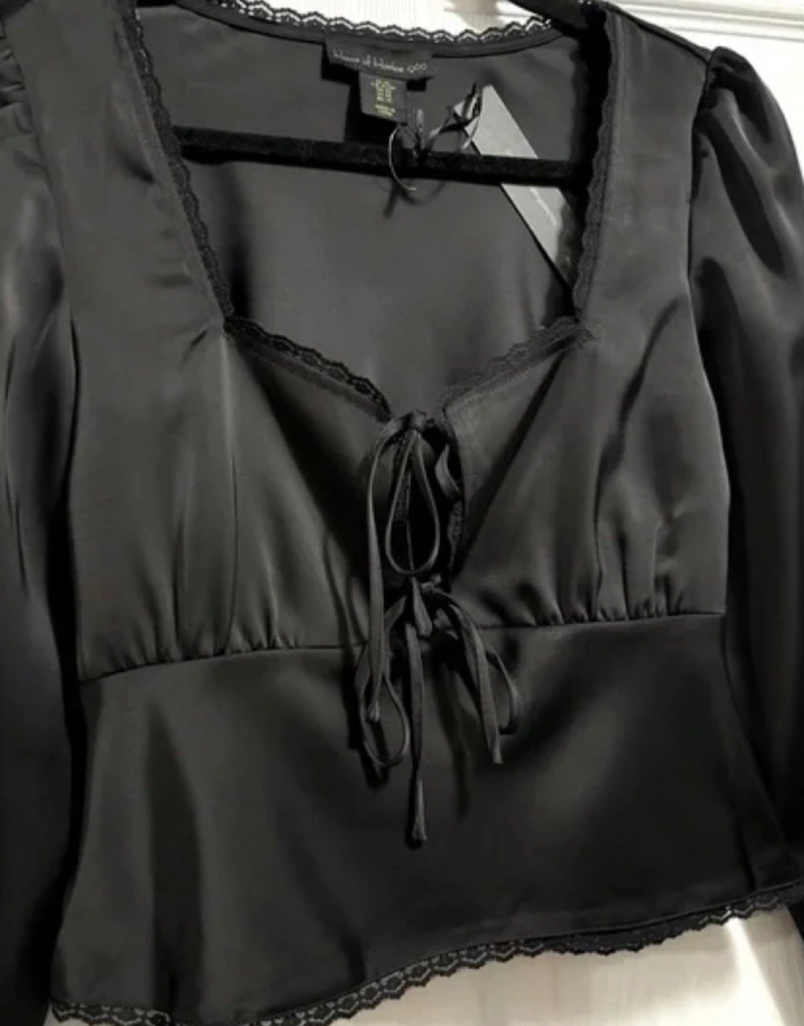 Gorgeous black satin top. Features long sleeves, lace trim, and a tie-front detail. Square neckline. New with tags 🏷️