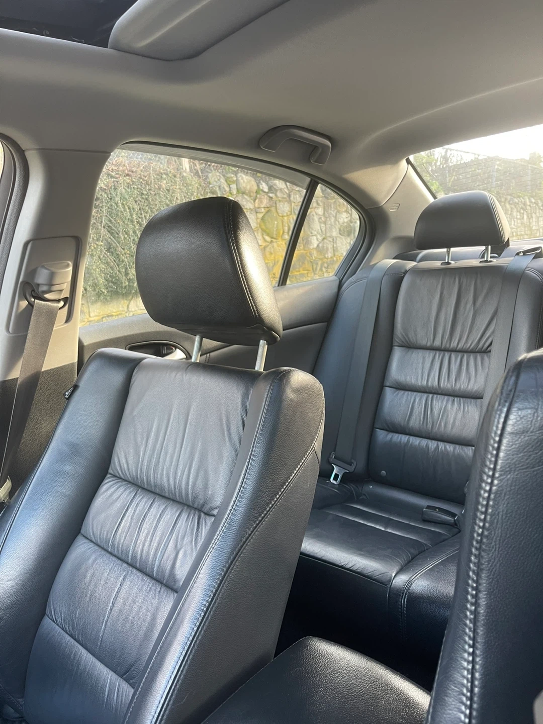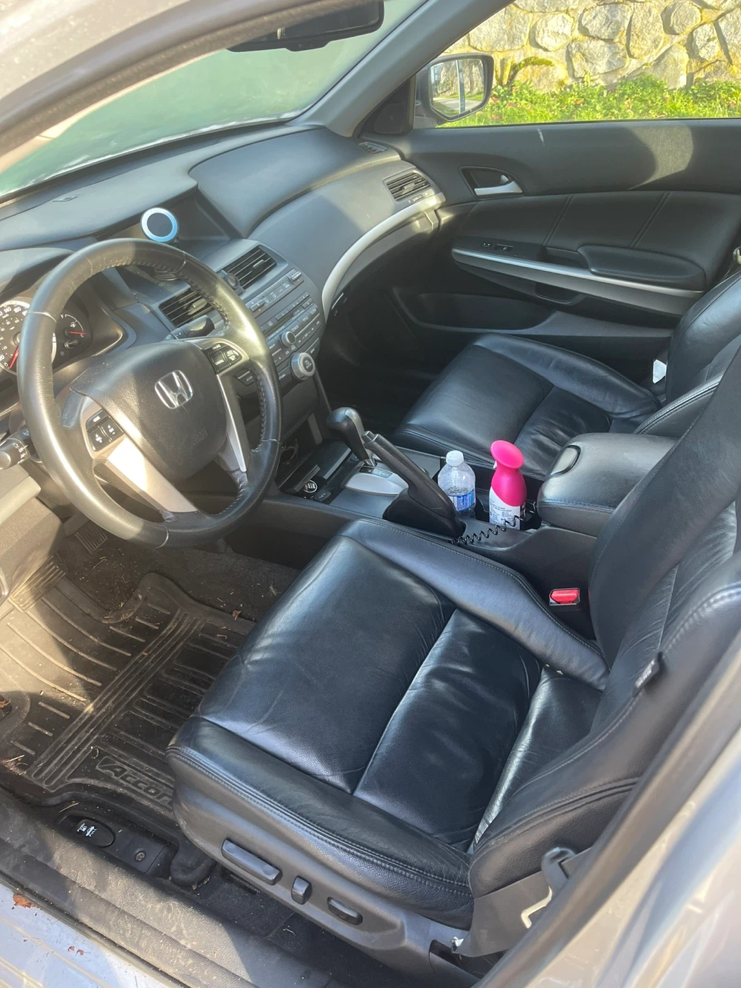 Silver Honda Accord sedan. It's a reliable four-door car with leather interior. Black leather seats and floor mats are visible inside.