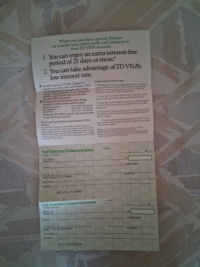 Buy & SellVintage 1985 TD Bank Visa Promo ChequesVintage 1985 TD Bank Visa Promo Cheques$7Available for pickup/public meetup in Mississauga. Cash and E Transfer accepted.WHERE TO MEETBud Gregory Boulevard & Gatineau AvenueView MapSELLERRobert EHurontario717 reviews0 chats·0 favorites·1 viewsSEND CHAT TO SELLERHi Robert E! I’m interested in your listing.Hi Robert E! I’m interested in your listing.Get the Karrot app to chatSign In to chat
